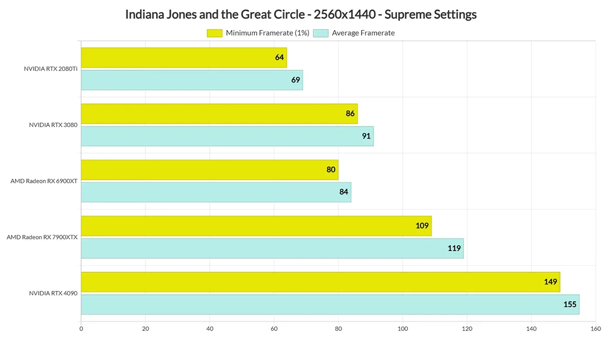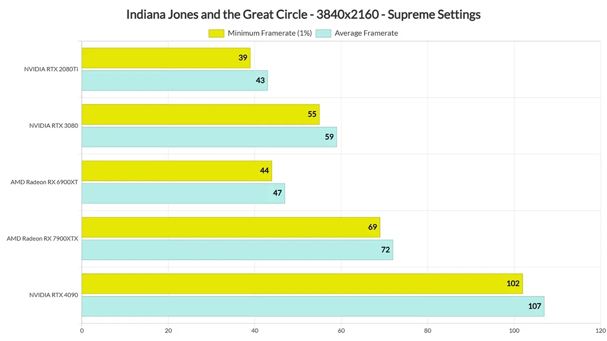 PC-версия игры Indiana Jones and the Great Circle была протестирована на различных видеокартах, таких как AMD Radeon RX 6900 XT, RX 7900 XTX и Nvidia RTX 2080 Ti, RTX 3080 и RTX 4090, а также с процессором AMD Ryzen 9 7950X3D (32 ГБ ОЗУ).