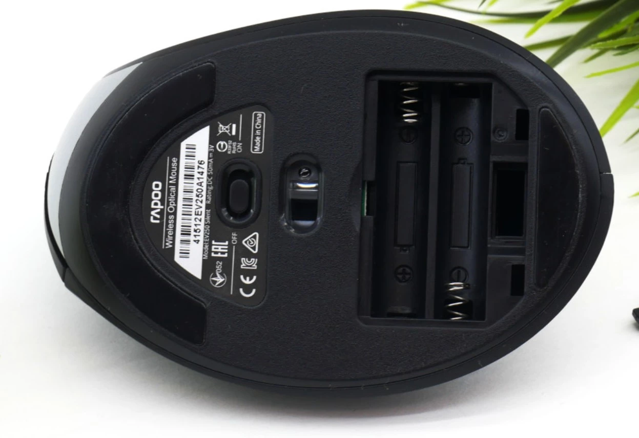 Если вы переживаете, что будет необходимость постоянно покупать батарейки для Rapoo EV250 Silent, не стоит. С помощью двух аккумуляторов ААА данное устройство может работать до полугода, даже с активным использованием. На нижней части есть кнопка, позволяющая включать и отключать устройство при необходимости.