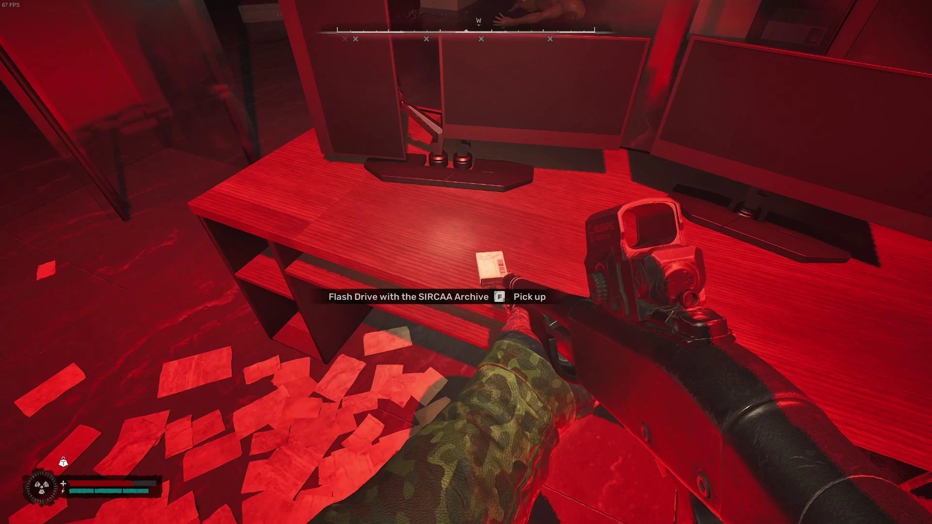 На среднем этаже вы наткнетесь на офис со стеклянными стенами, который освещен красным светом. На столе в этом помещении находится флешка – не забудьте ее поднять.