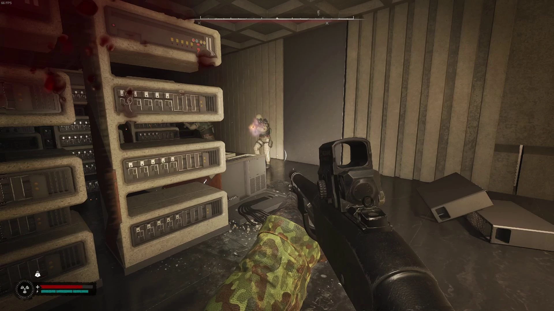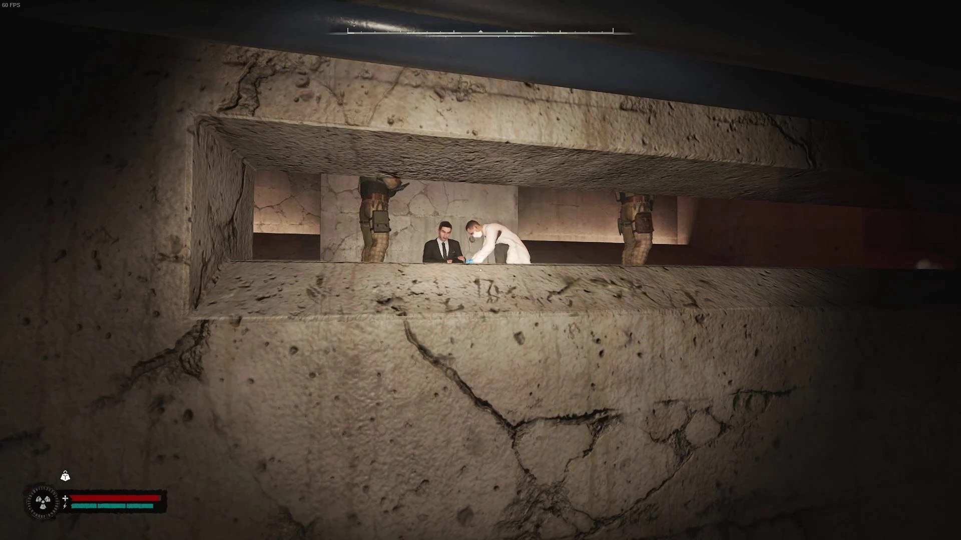 В просторной комнате вам предстоит сразиться с группой мутантов и солдат. Рекомендуется подождать, пока обе стороны не ослабят друг друга, прежде чем вступать в бой.