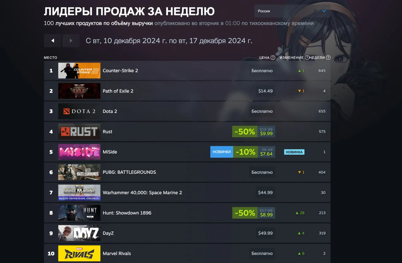 CS2 заняла первое место и в российском рейтинге, а единственным новинкой стала RPG с элементами хоррора MiSide (5 место). Кроме того, в топ вернулись Hunt: Showdown 1896 (рост на 28 пунктов и 8 место), DayZ (рост на 4 пункта и 9 место) и Marvel Rivals (рост на 6 пунктов и 10 место).