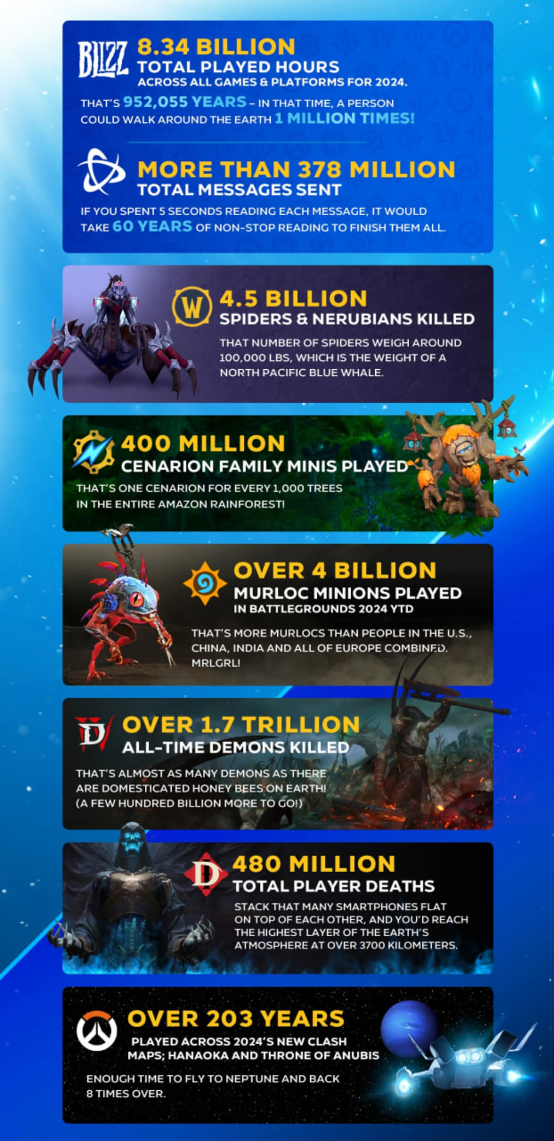 В 2024 году в World of Warcraft пользователи уничтожили 4,5 миллиарда пауков и нерубианцев, в то время как в Diablo IV было истреблено 1,7 триллиона демонов. Также за год фанаты франшизы Diablo погибли 480 миллионов раз.