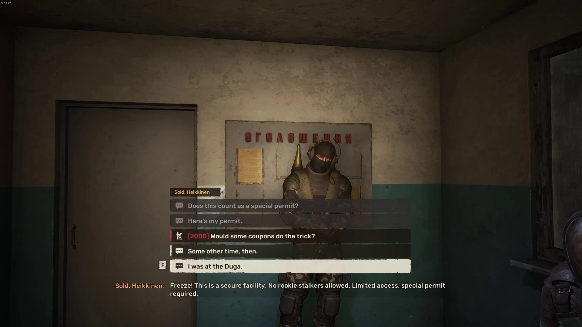 Когда вы войдете, к вам подойдет солдат, который не даст вам возможность пройти. Но если вы выберете реплику «Я был в Дуге», охранник впустит вас дальше.