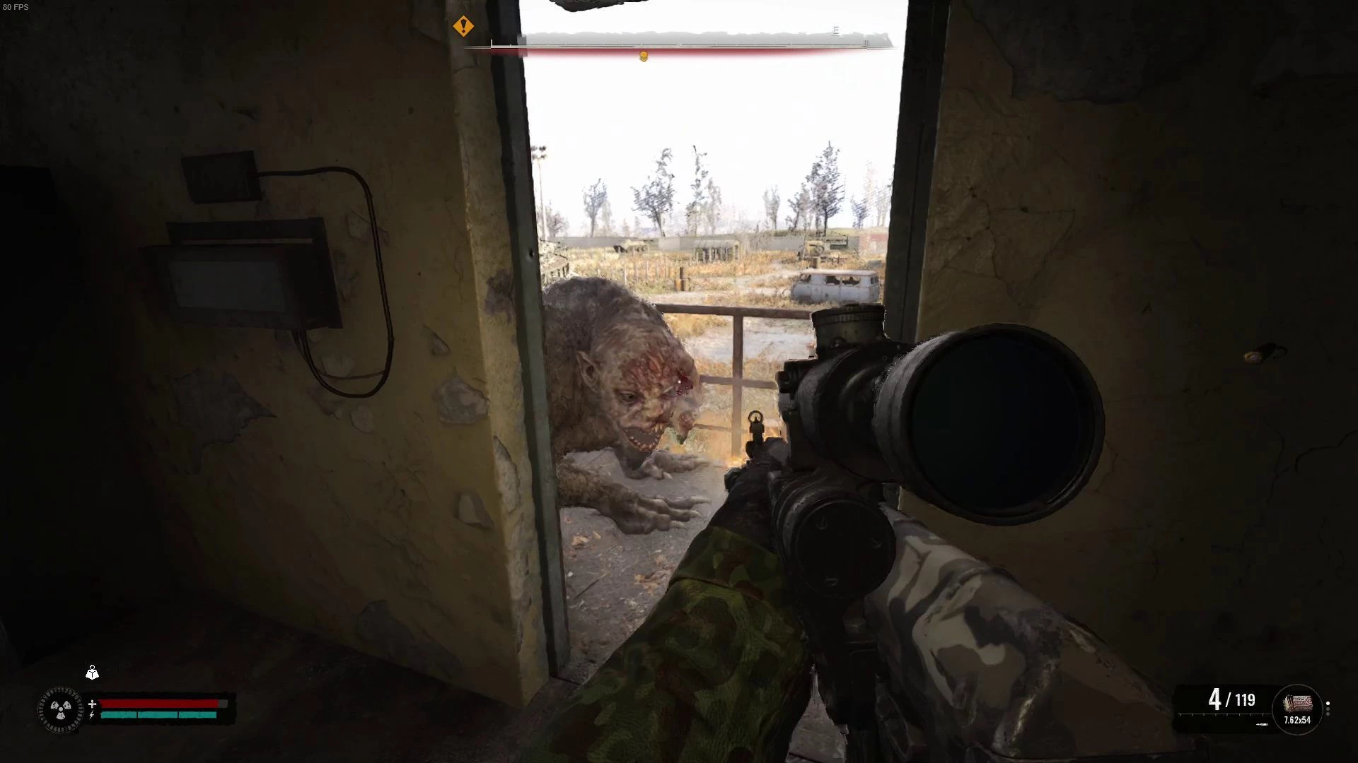 Вооружитесь огнестрельным оружием и стрельните в химеру, лежащую на рельсах. Затем быстро вернитесь в здание и закройте за собой дверь.
