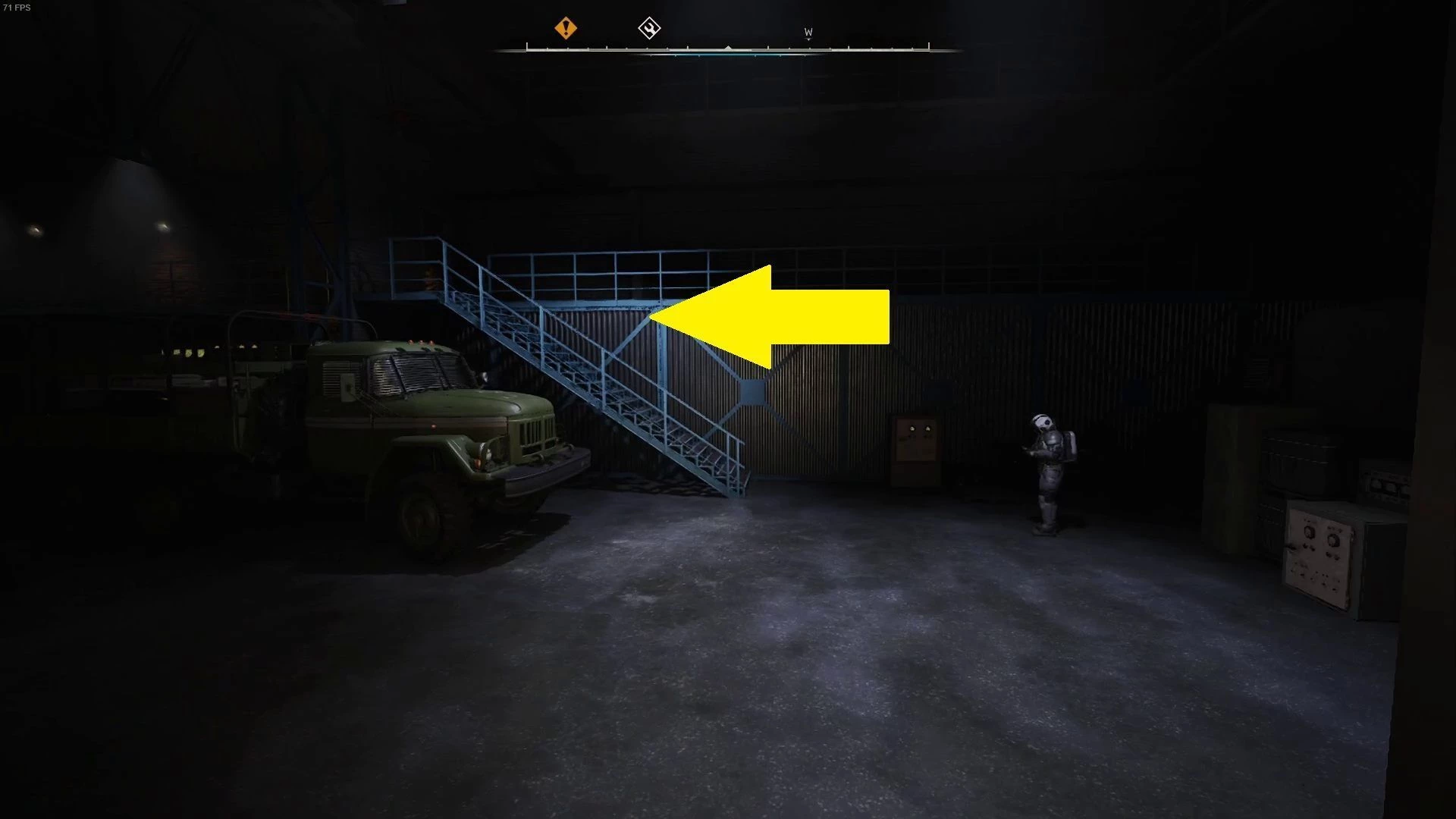Войдите в дверь слева от стола, затем поверните налево и поднимитесь по лестнице.