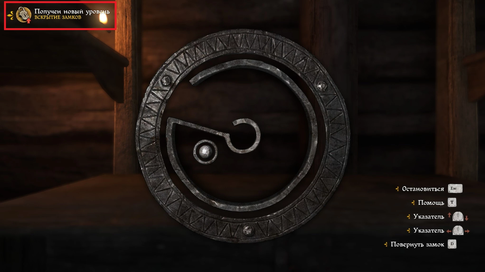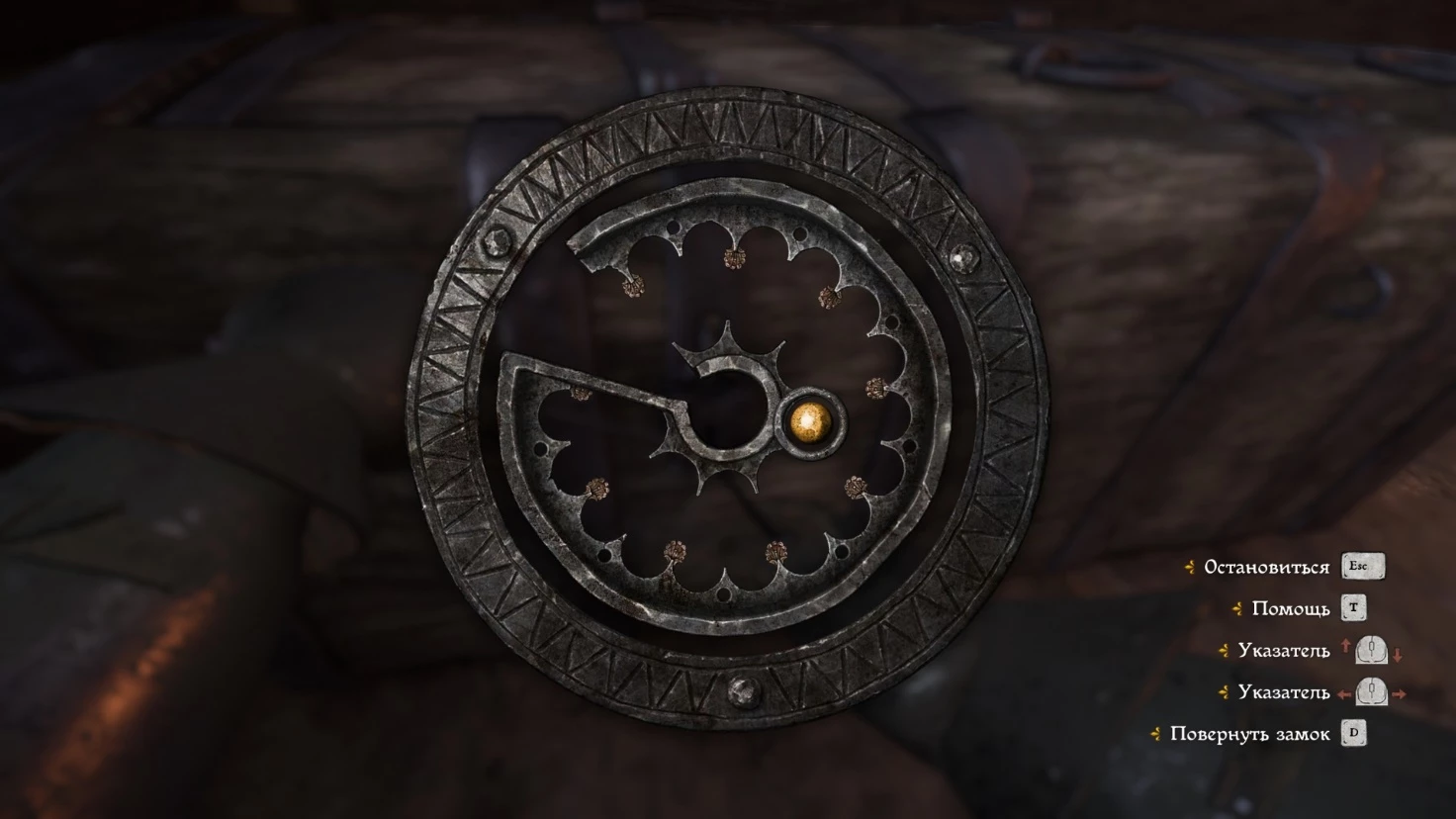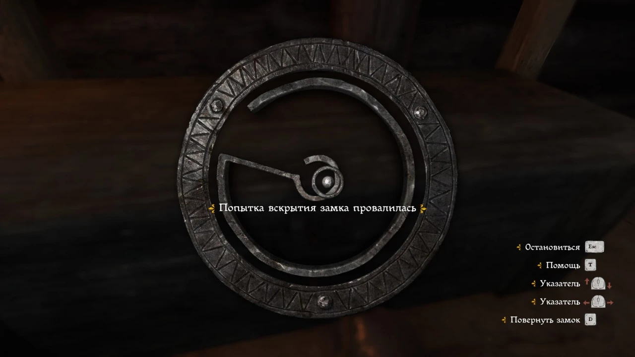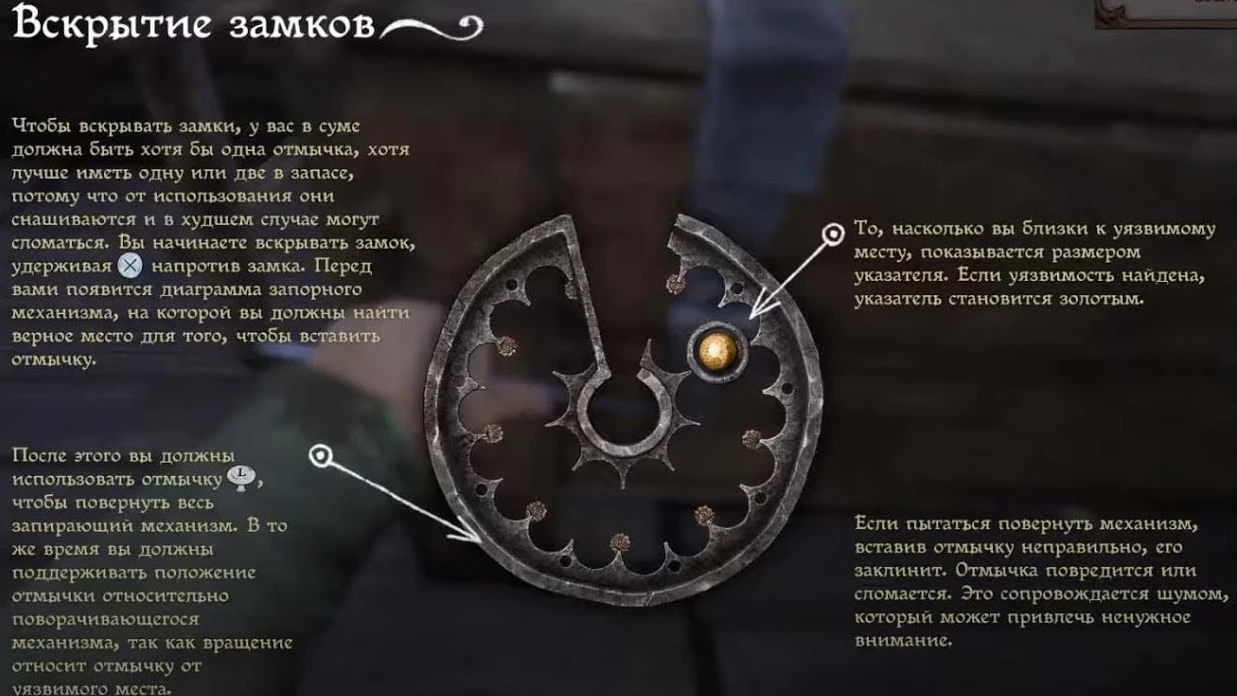 Объяснить все аспекты механики взлома не так-то просто, но можно кратко изложить суть: вам необходимо переместить кружок в центр замка так, чтобы он изменил цвет на желтый. На ПК это выполняется мышью, а на консолях – с помощью правого стика. После этого нужно удерживать клавишу D (или манипулировать левым стиком), чтобы механизм вращался до тех пор, пока замок не откроется. Важно, чтобы кружок оставался в правильной позиции, иначе отмычка может сломаться.