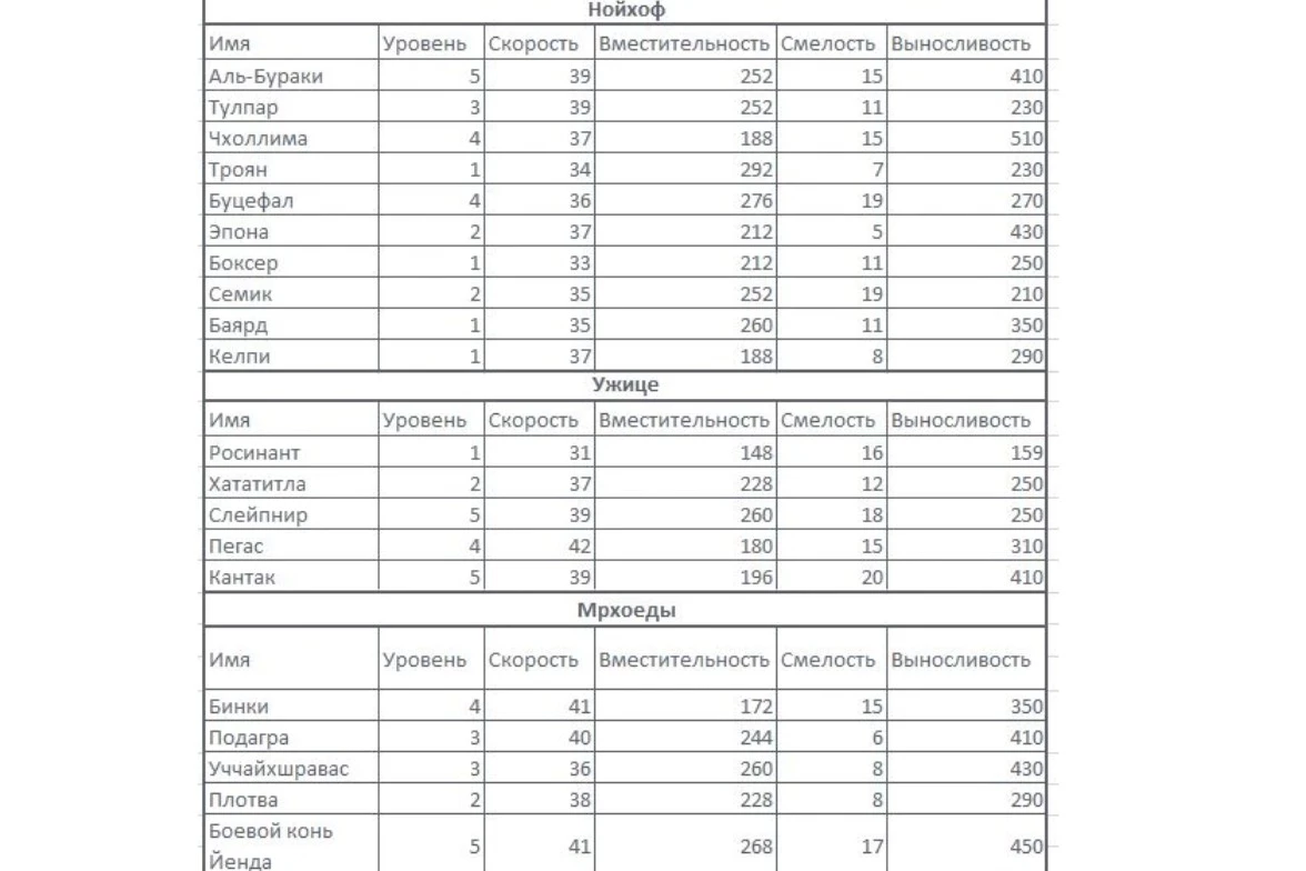 Общаясь с купцом, вы увидите только общий уровень, поэтому лучше перед покупкой осмотреть каждую лошадь на конюшне и запомнить наиболее подходящую. В игре вы встретите лошадь по имени Плотва, но она не подарит вам ведьмачьей силы и ее характеристики не такие выдающиеся. Представляем таблицу с характеристиками всех доступных для покупки лошадей и их местонахождением.