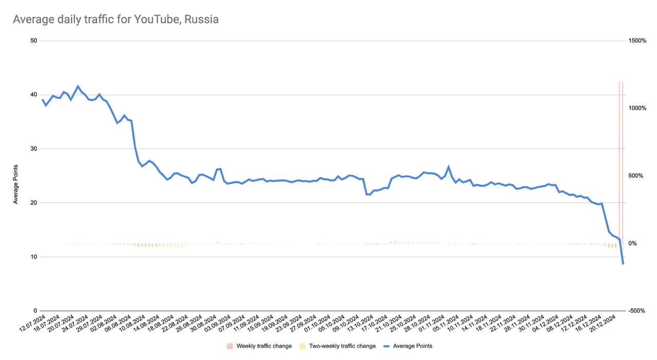 Это снижение было зафиксировано 23 декабря. Однако серьезные трудности с доступом к YouTube у пользователей начали возникать еще 19 числа, затрагивая и мобильные сети.