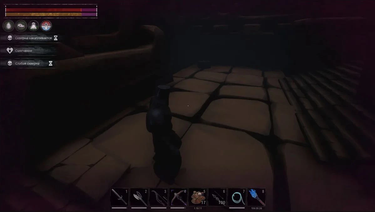 За возвышением, на котором стоит плита, есть лестница ведущая вниз. Под ней можно найти пару сундуков. Поднявшись наверх вы окажитесь в галерее. Здесь можно найти пару сундуков с серым лотосом, но за них придется сразиться с обитающей тут нежитью.