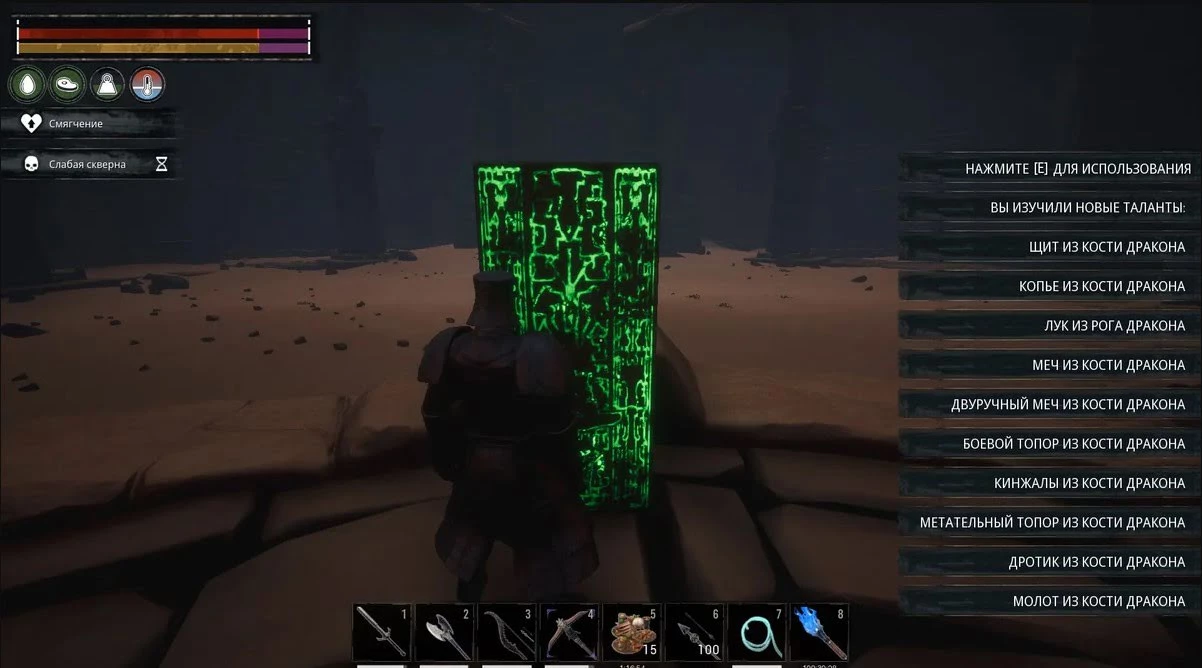 Далее двигайтесь в проход и выходите на арену к дракону. С ним можно сразиться, а можно просто пробежать мимо, вдоль стеночки. Добравшись до противоположной стороны, поднимитесь на площадку и возле каменной плиты изучите рецепты оружия из Кости Дракона.