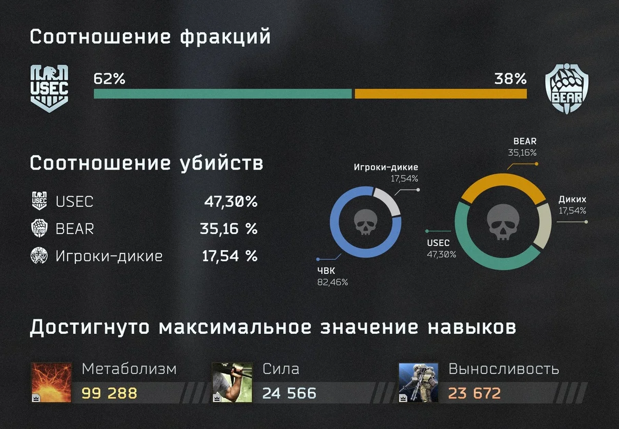 Разработчики Battlestate Games представили статистику по Escape from Tarkov за период действия патча 0.15.0, который вышел в августе этого года. Наиболее востребованной фракцией оказалась USEC, которую выбрали 62% игроков, что также отразилось на статистике убийств — 47,30% всех фрагов принадлежит именно игрокам USEC.