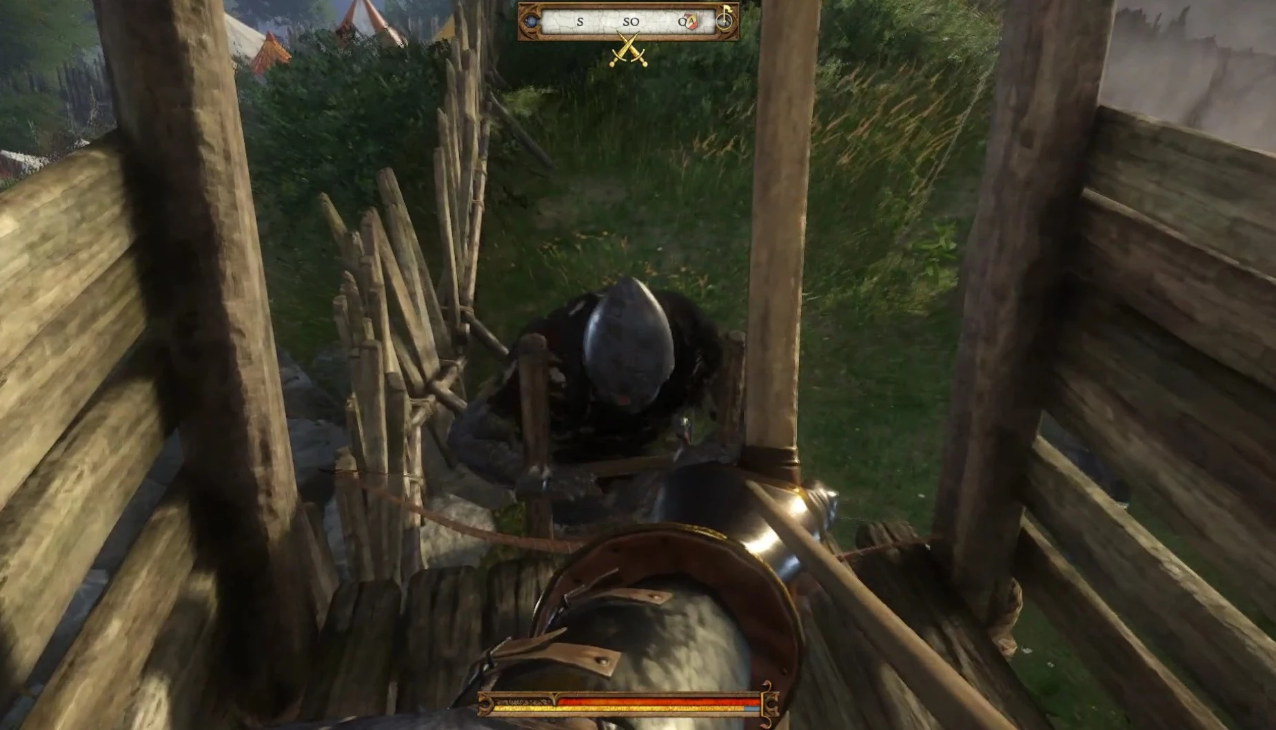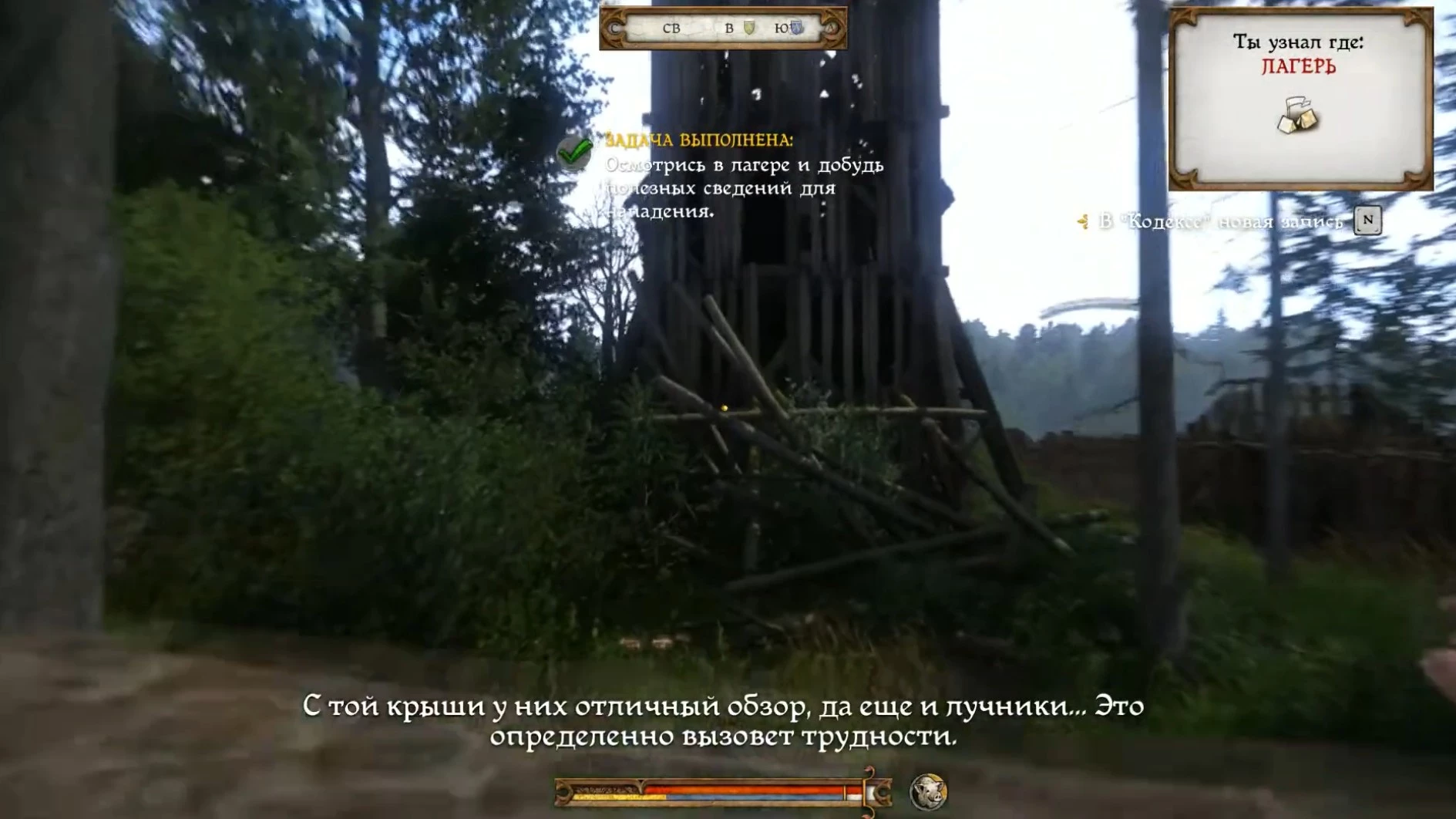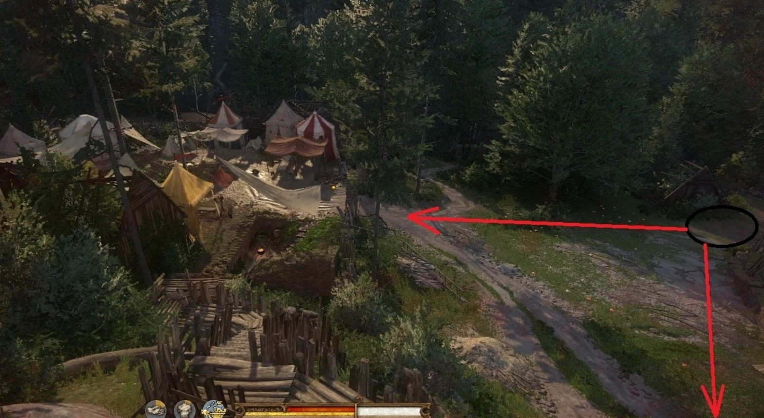 Для начала необходимо провести разведку и собрать данные для предстоящей атаки на отряд пана Радцига. Если вы следовали указаниям Пето, то тропинка справа от деревянного моста ведет прямо в лагерь. Однако даже с максимальным уровнем скрытности пройти по ней незамеченным крайне сложно. Лучше обойти территорию слева по часовой стрелке, держась на расстоянии, чтобы избежать обнаружения.