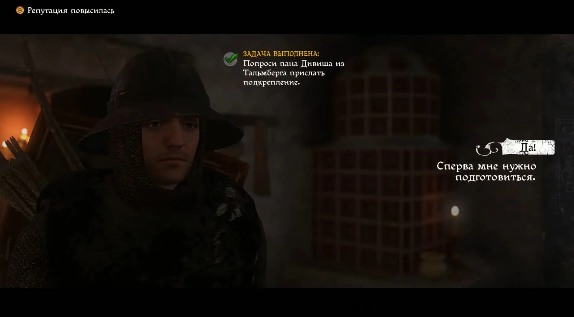 Хотя дело срочное и требует быстрых действий, после передачи сообщения пану Дивишу вы можете выбрать опцию «Сначала мне нужно подготовиться», что будет полезно. Как только вы сообщите Дивишу о готовности, начнется новое задание под названием «Крещение огнем», и Индро отправится в свой первый боевой поход.