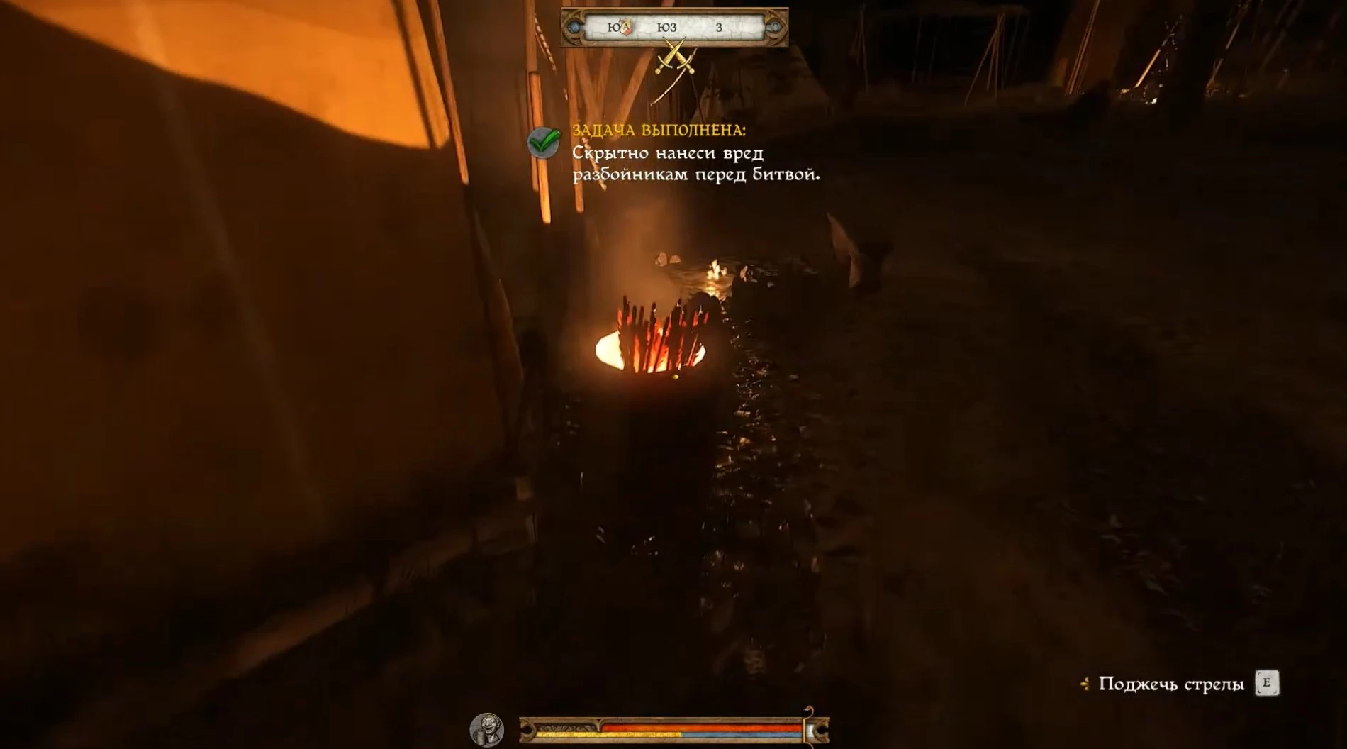 Стрелы находятся в бочках, некоторые рядом с котлами, другие — у палаток. Поджечь их можно, нажав клавишу взаимодействия, но это привлечет внимание ближайшего половца. Стелс, скорее всего, закончится, и вам придется быстро искать оставшиеся бочки.