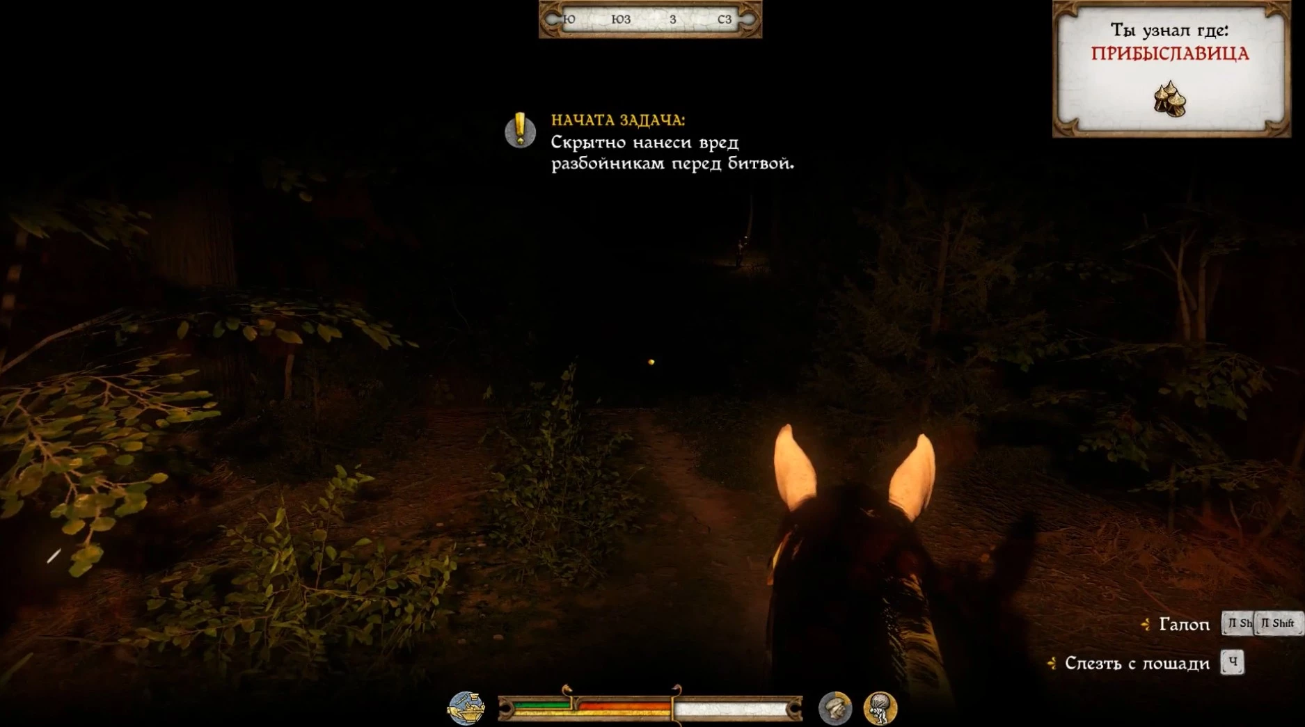 В итоге вы окажетесь у заброшенного поселения Прибыславица. Как только заметите очертания лагеря и людей вдалеке, остановитесь, переключитесь в режим скрытности и двигайтесь осторожно. Вокруг патрулируют караульные, а на входе стоят стражники. Если вас обнаружат, придется либо бежать, либо сражаться, что, скорее всего, приведет к перезапуску миссии. К счастью, игра сохранится автоматически, как только вы найдете Прибыславицу и получите соответствующее уведомление.