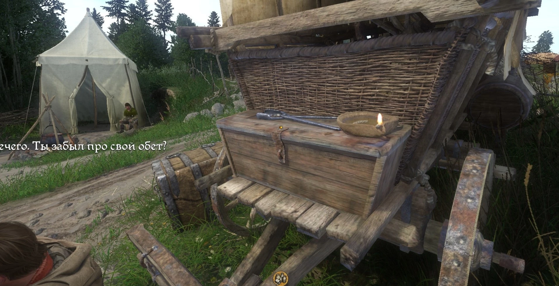 Теперь вернитесь в лагерь и снова положите испорченное оружие в сундук.
