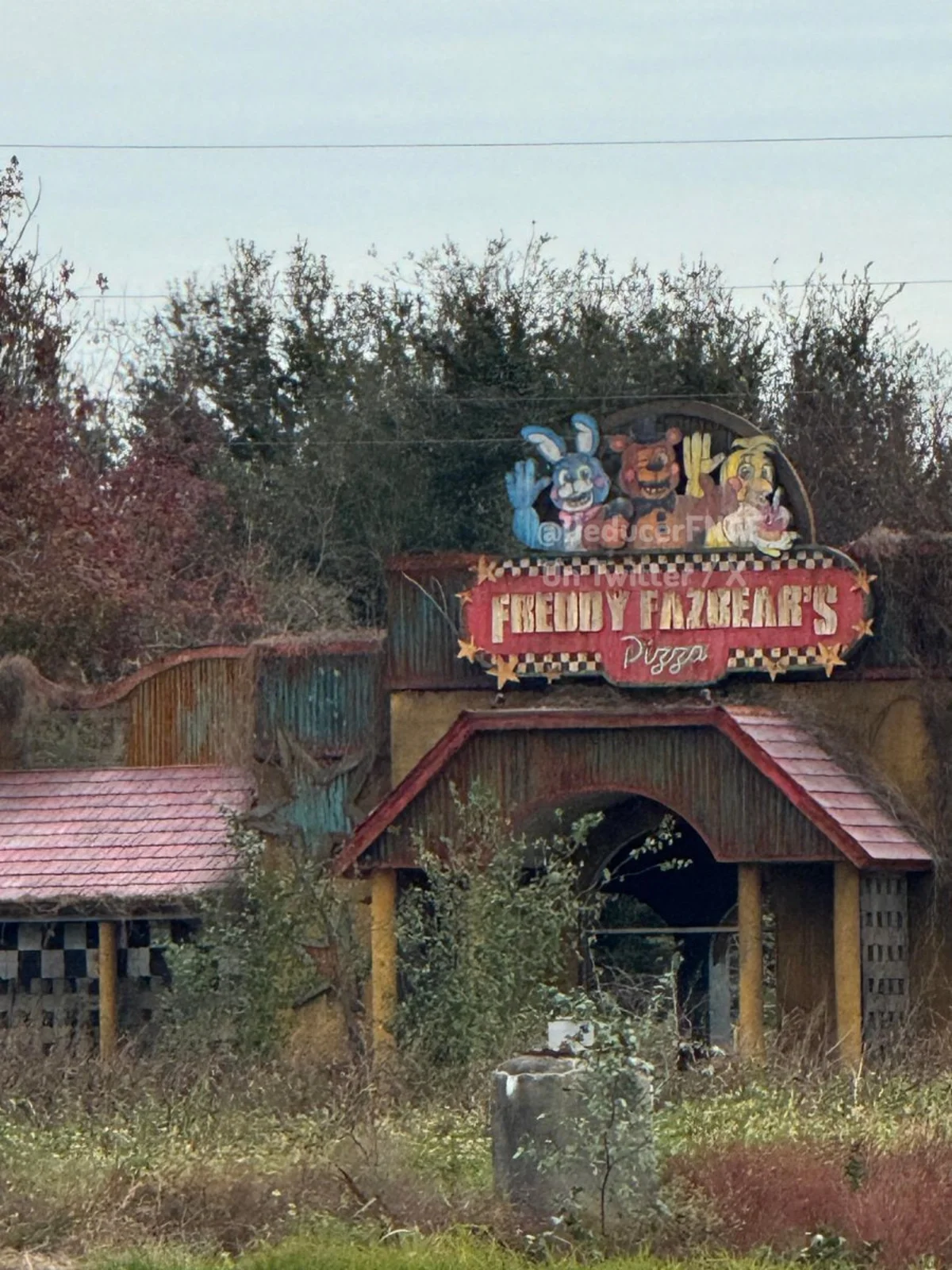 На снимках можно заметить ржавый знак старой пиццерии, украшенный образами зловещих аниматроников, среди которых выделяются Фредди, Бонни и Чика. Сама постройка уже заросла травой, что создает атмосферу заброшенности.