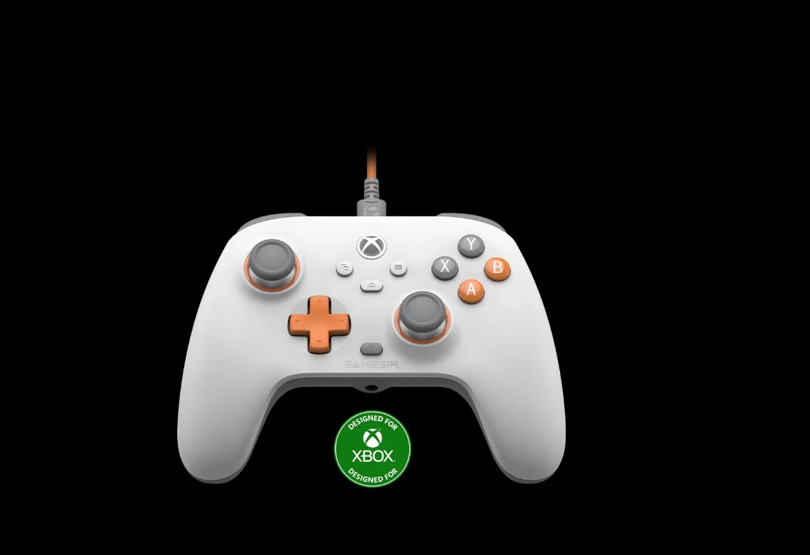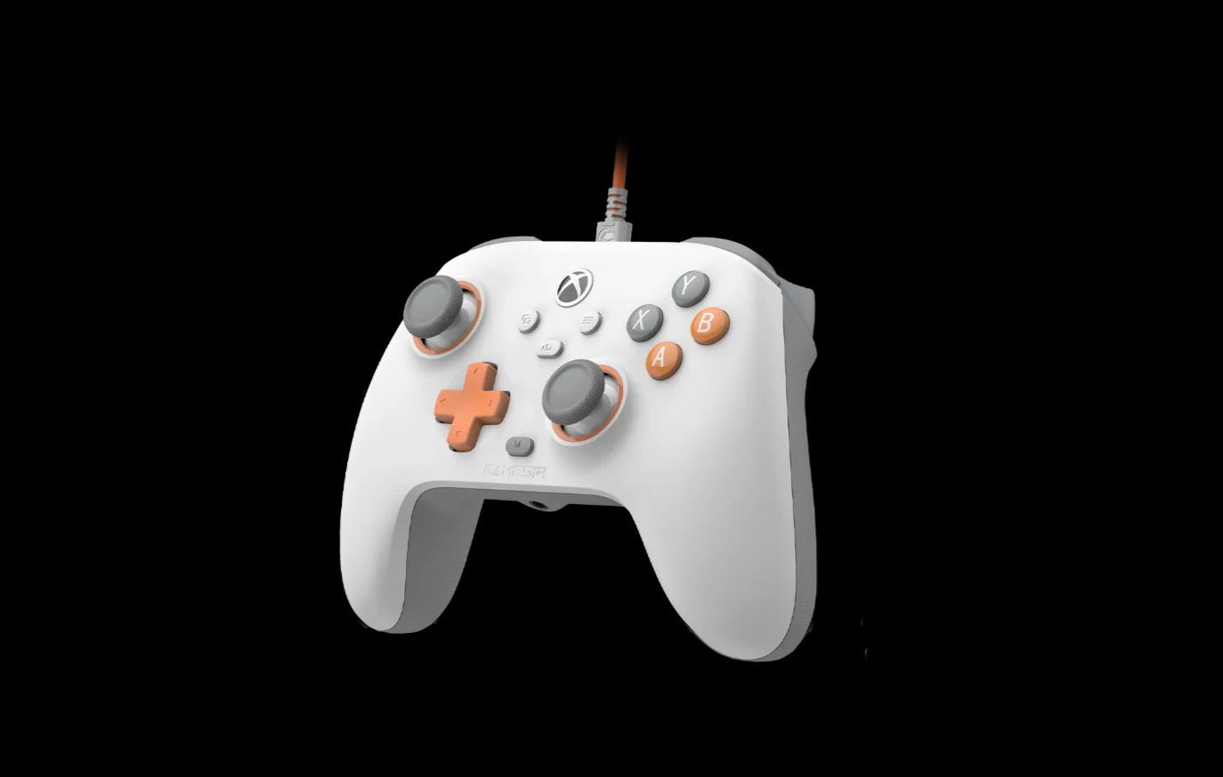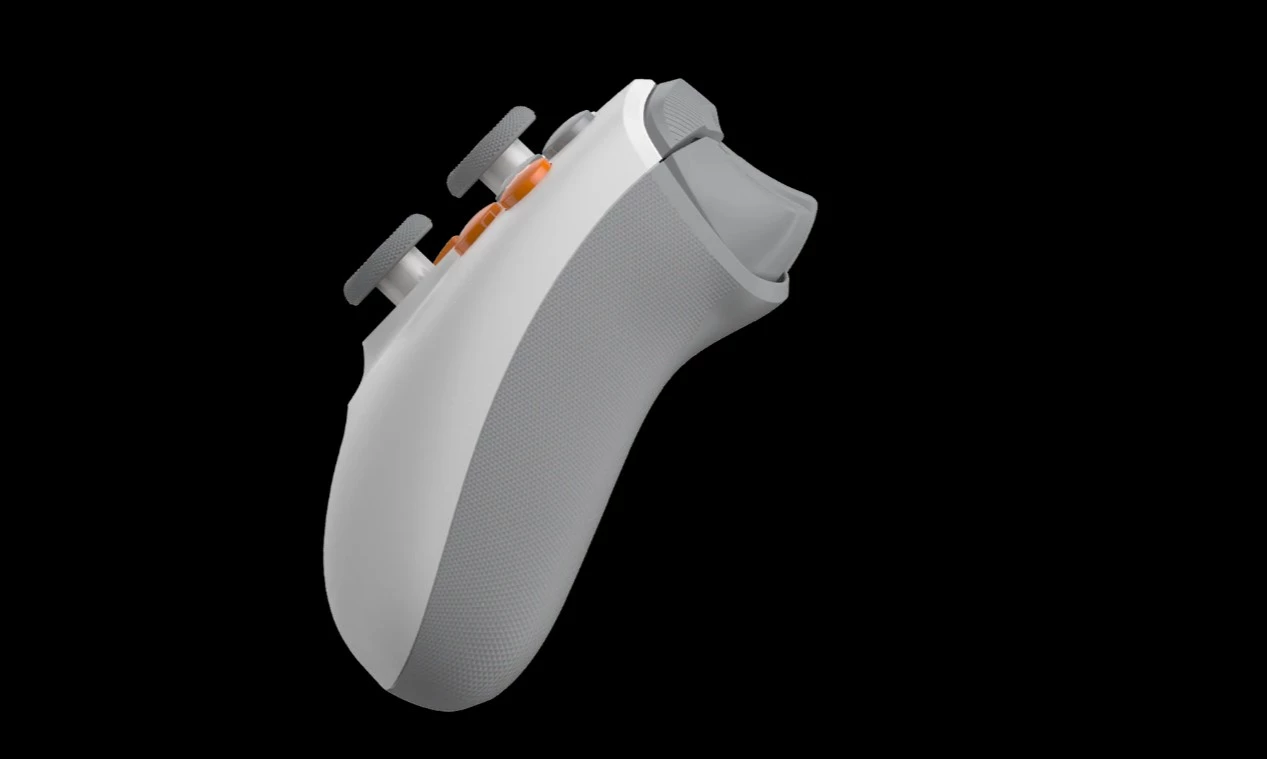 Форма устройства знакома и проверена временем: текстурированные ручки и асимметрично размещенные стики вызывают ассоциации с оригинальным Xbox-контроллером для Series X/S. Область вокруг стиков выделена оранжевым, а сами стики серые с углублением и текстурой.
