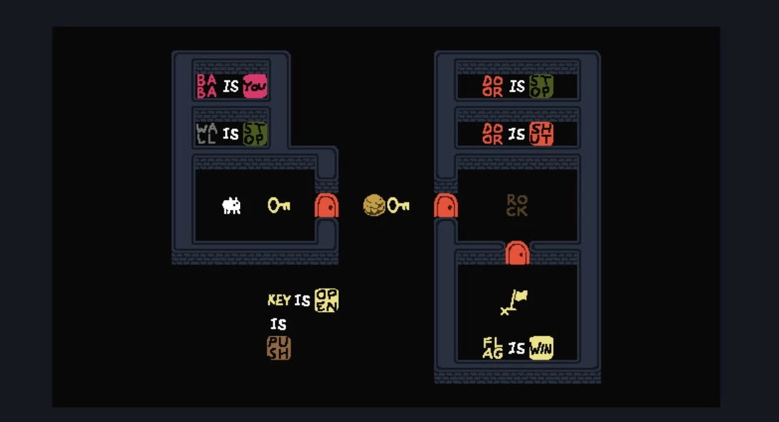 Здесь вместо перемещения блоков вы двигаете слова, которые представляют собой правила, действующие на каждом уровне. Это можно описать как взаимодействие с частью игрового кода в режиме реального времени.