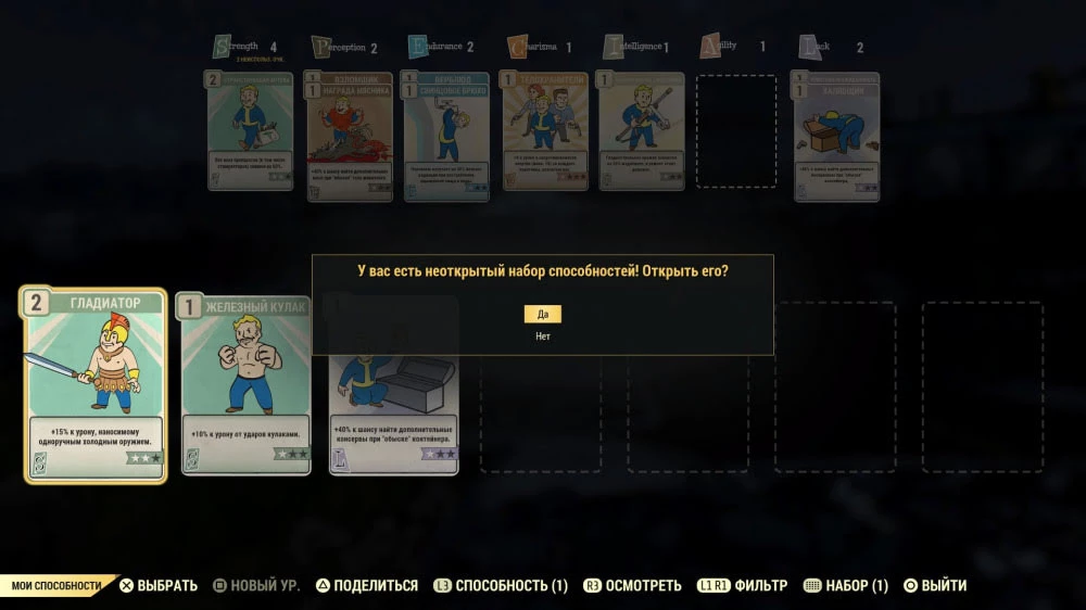 Дубликаты карт можно комбинировать, чтобы создавать лучшие версии этих перков. Например, карта перка «Гладиатор» обычно увеличивает урон от одноручного оружия ближнего боя на 10%, однако, если вы комбинируете ее с такой же картой, вы сможете увеличить этот показатель. При этом вы также увеличиваете количество очков, которые вам нужно иметь в этой стате, чтобы экипировать эту карту перка.