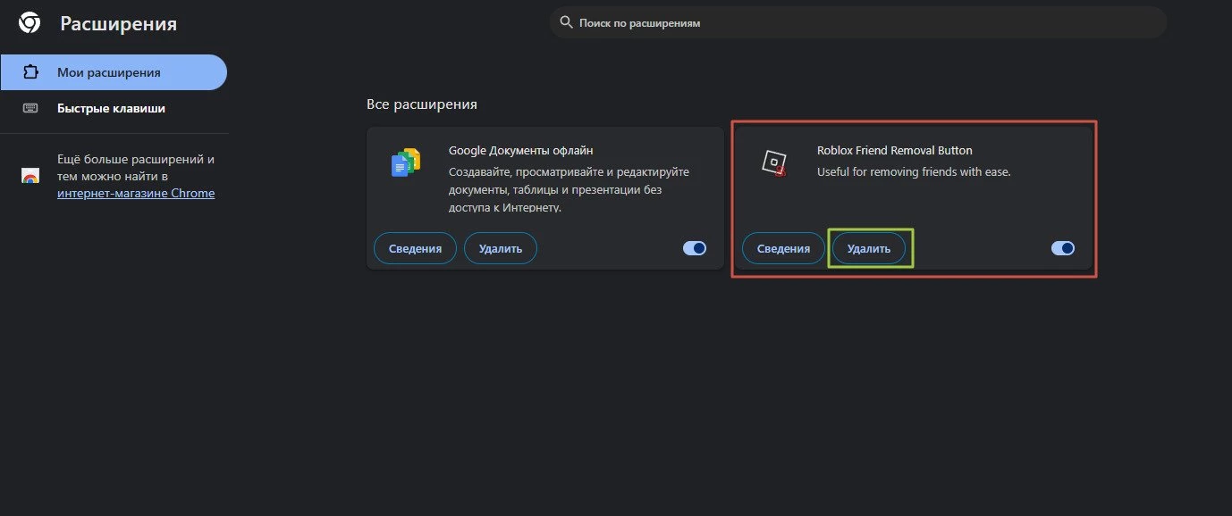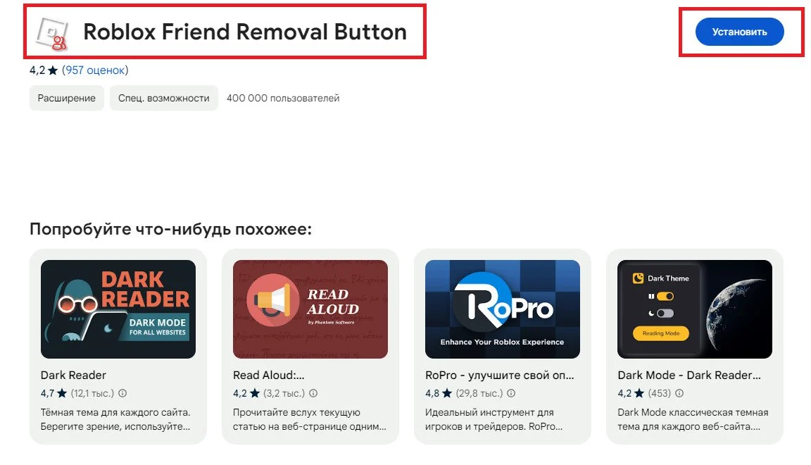 Для начала откройте браузер и зайдите в интернет-магазин Chrome. Найдите расширение Roblox Friend Removal Button и установите его в Хром. Вернитесь к списку друзей и удаляйте их, используя новые кнопки.