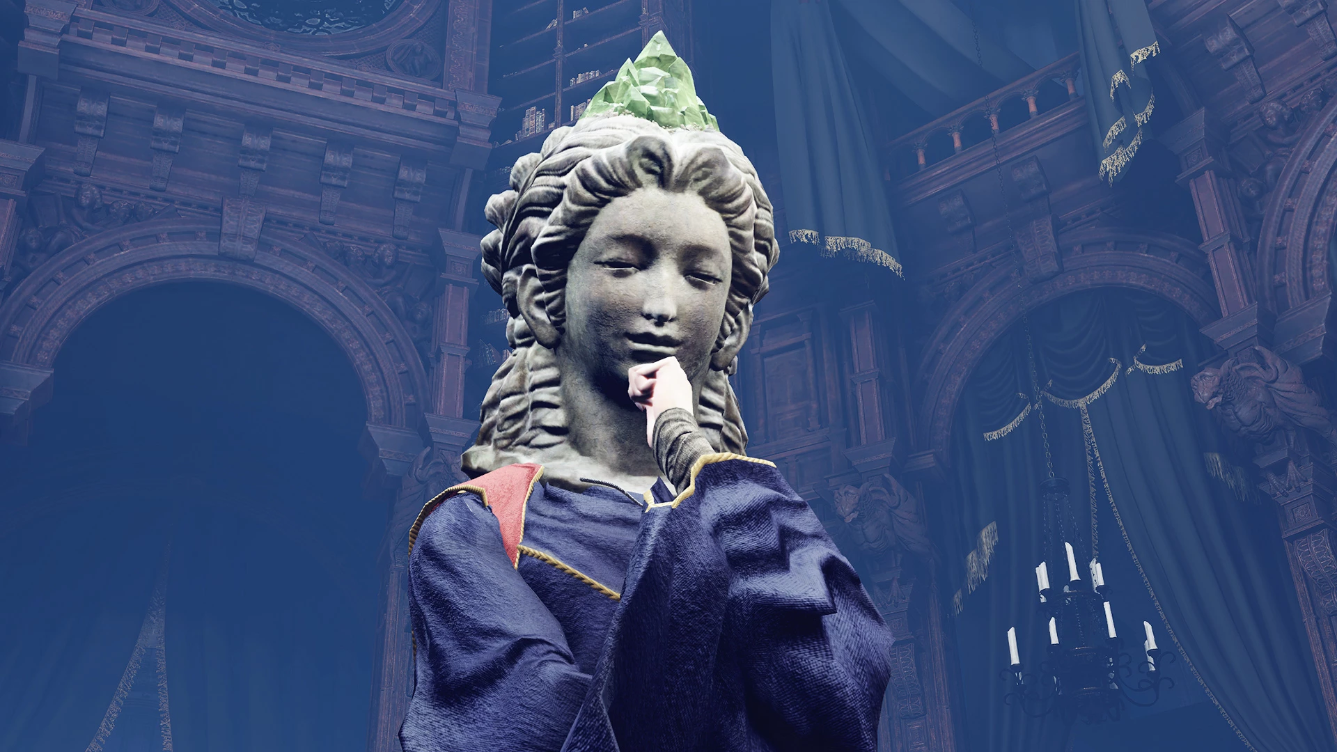 Маления, величественная богиня гнили, облачена в золотистую броню с меховым воротником, а ее алый плащ напоминает о зреющей крови. Ее шлем, украшенный крылатыми рогами, подчеркивает ее божественную внешность, несмотря на то, что скрытые под доспехами раны и гниль разъедают ее тело.