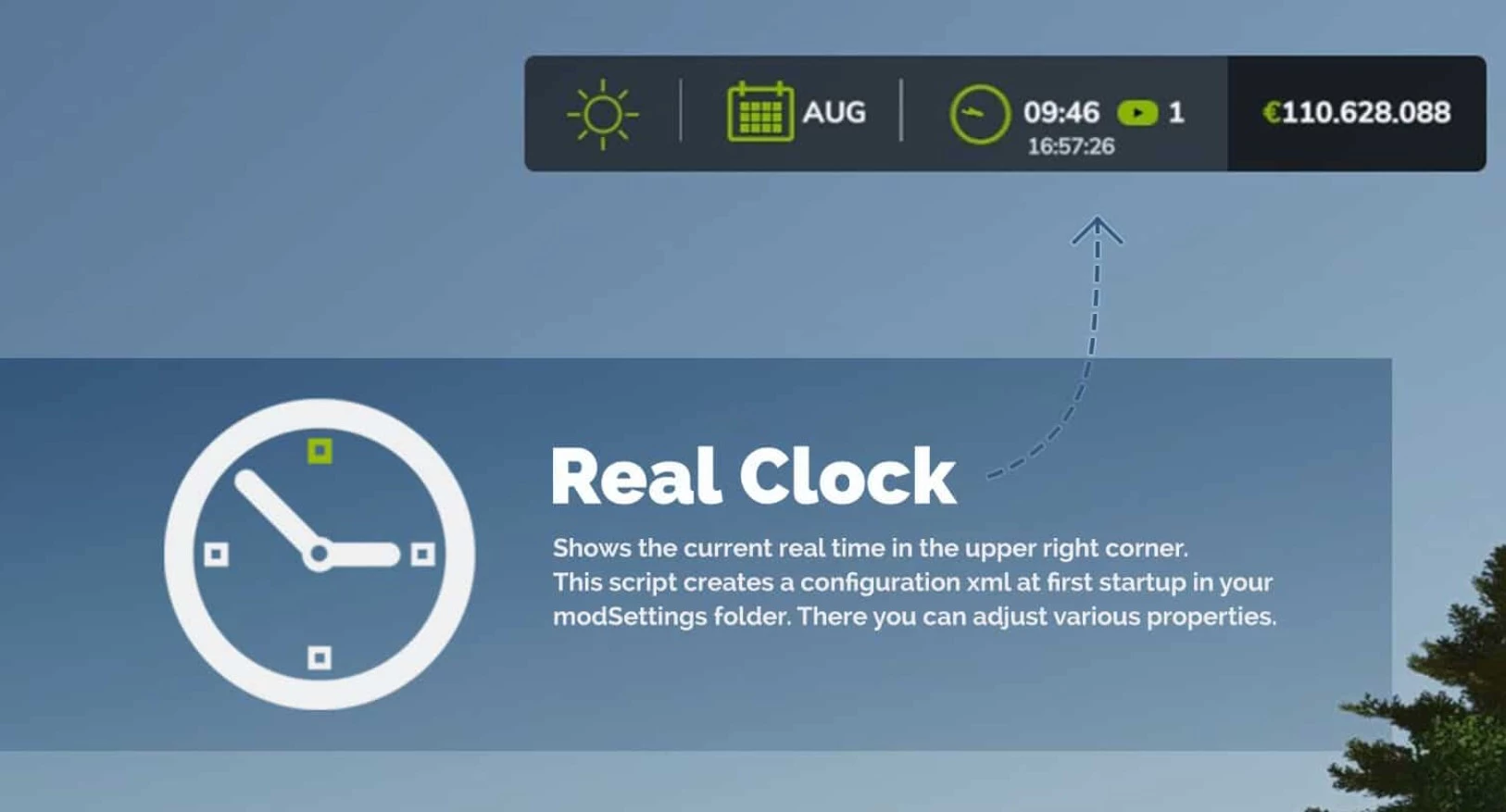 С модом Real Clock вы больше не будете переживать, что пропустите день сбора урожая или важную встречу, так как в правом верхнем углу будут отображаться часы с реальным и игровым временем.