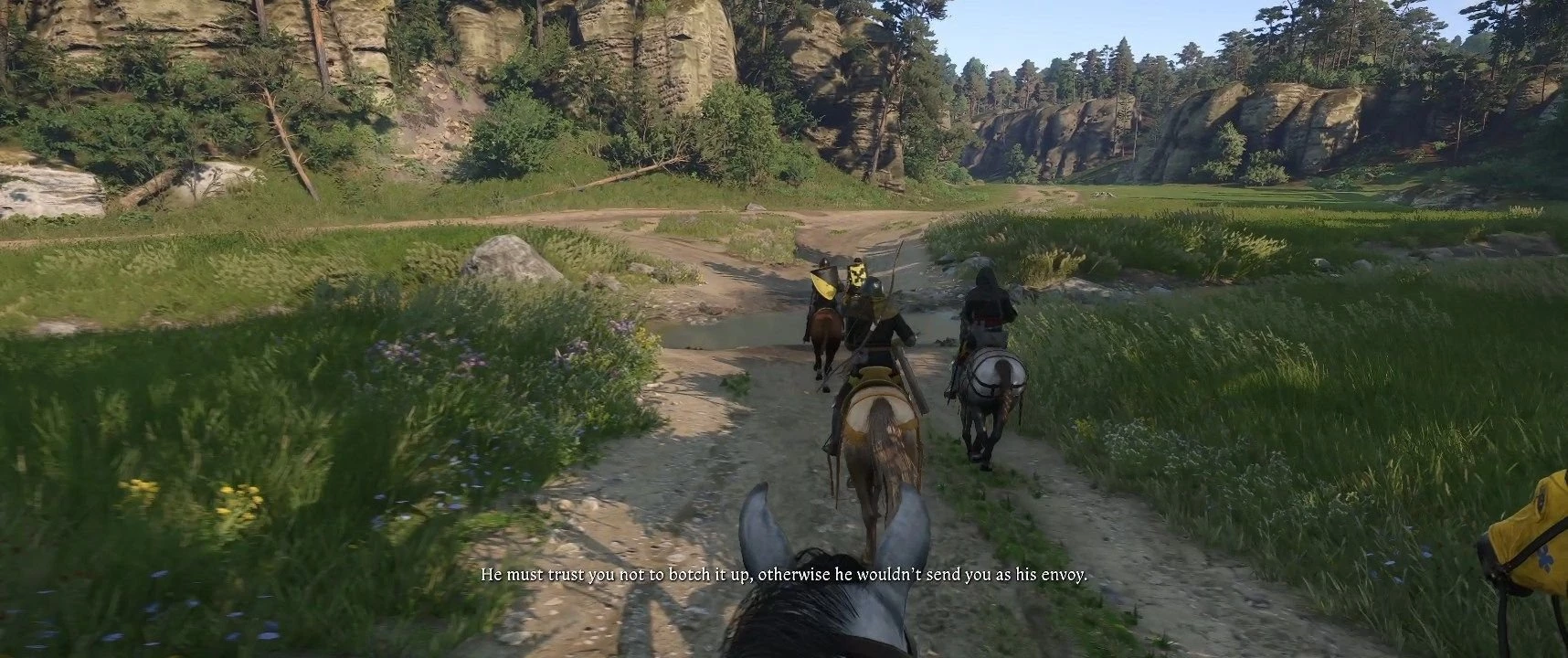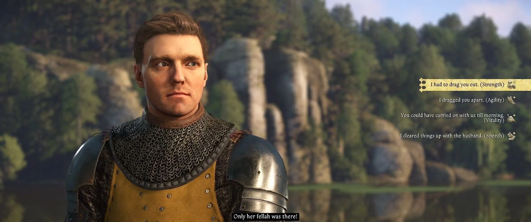 После кат-сцены вы переместитесь к Генри, который следует за Гансом Капуном. Ваша лошадь автоматически движется, и вам нужно будет отвечать на вопросы Ганса - ваши ответы не критичны. Вскоре вы встретите отряд солдат во главе с капитаном Томасом, и вам предстоит разрядить напряжение. Сначала вам необходимо представиться, что в некоторой степени повлияет на ваши начальные параметры. Если представитесь солдатом, увеличатся боевые характеристики, как советник — убеждение, а как разведчик — скрытность. Затем пройдет короткое руководство по убеждению, где выберите вариант, соответствующий вашей профессии. Выбор второго варианта (Харизма) оказался удачным в любых обстоятельствах. Даже если убеждение не удастся, Ганс вас выручит.