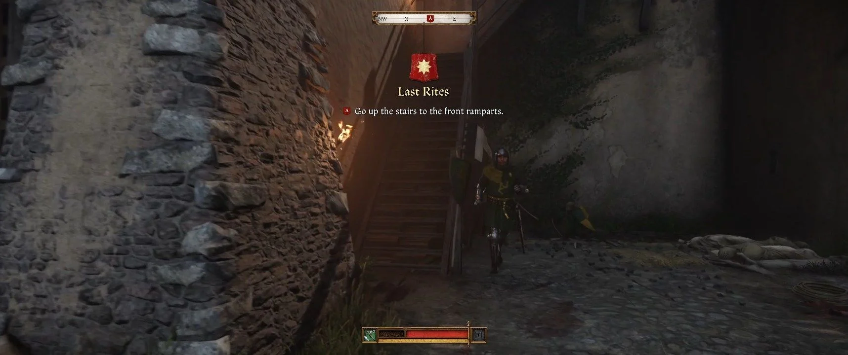 Вы начнете квест в разгар осады. Вначале вас ждет короткая, заранее запланированная миссия. Когда квест начнется, поднимайтесь по лестнице на стене. Вам необходимо будет стрелять в противников. На этом этапе вам ничего не угрожает, поэтому ваша точность не критична — воспользуйтесь моментом, чтобы привыкнуть к механике прицеливания и немного покачивающемуся арбалету. После выстрела удерживайте кнопку прицеливания для перезарядки.