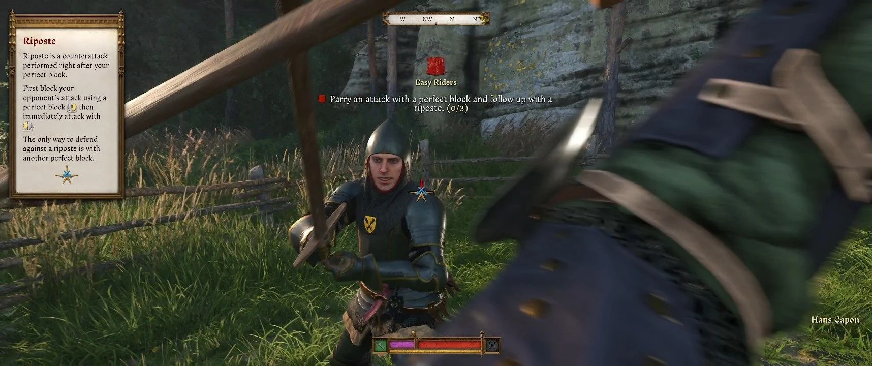 Когда будете готовы, поговорите с Гансом Капоном и получите от него снаряжение: учебный меч, капюшон и шлем. Пройдите через забор на импровизированную арену для обучения в боевых искусствах. Следуйте игровым подсказкам — вы научитесь атаковать, использовать комбинации, блокировать, выполнять идеальные блоки, контратаки и обходить защиту противника. В конце тренировки Ганс предложит дуэль с ставкой в 100 грошей — вы можете согласиться, удвоить ставку или сражаться без беттинга. Если вы помните боевую систему из предыдущей игры, вам должно быть под силу одолеть Ганса.