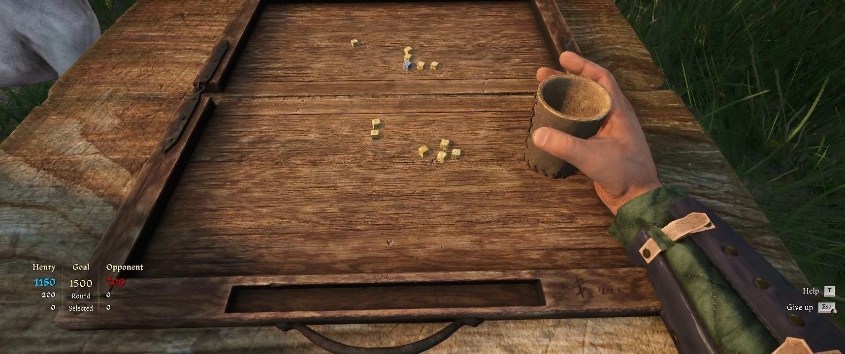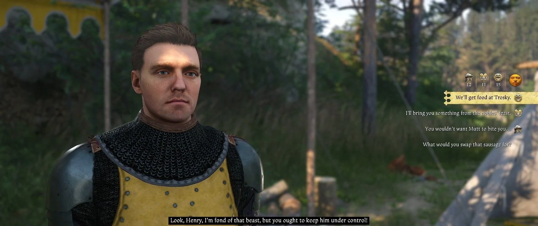 После успешного диалога вы сможете разбить лагерь. Перед тем как встретиться с Гансом, есть возможность выполнить дополнительную задачу — накормить свою собаку Матта. Для этого позовите собаку и поговорите с Овсом, поваром у костра. У него есть колбаса, которую вы можете получить двумя способами: путем убеждения (это удалось сделать с помощью Харизмы) или обмена. Овс попросит вернуть своё кольцо, которое он проиграл в кости солдату Танкарду, сидящему за столом. Вы можете сыграть с ним в кости, стараясь сколько угодно, так как неудачи не повлекут за собой последствий. Танкард рискует, часто теряя очки, даже когда у него осталось мало костей. Кольцо можно обменять на колбасу для собаки. Если вы уже получили колбасу через убеждение, вы можете оставить кольцо себе или вернуть Овсу (вознаграждения за это не будет).