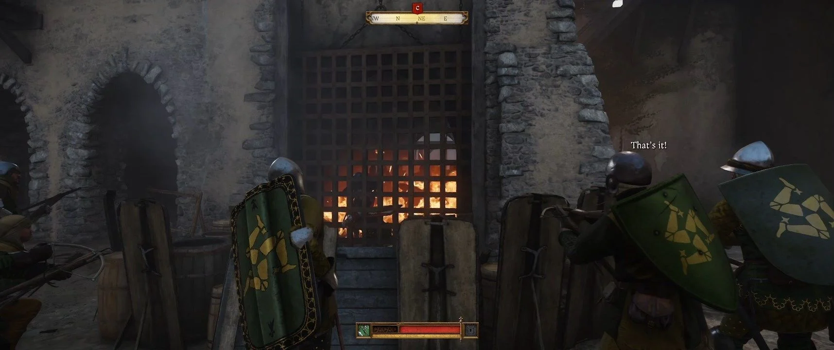 Спустя некоторое время на мосту появится большая группа врагов. Спуститесь во двор, где сможете стрелять в солдат через ворота, но это не обязательно — вскоре ваши союзники выльют горящее масло на противников. Командир прикажет вам следовать за ним. Вы вновь окажетесь у стены, где вам нужно будет опрокинуть лестницу, находящуюся слева от вас. Удерживайте кнопку взаимодействия, а за преграды прячьтесь по мере необходимости — ваша поддержка от командира должна быть достаточной. Успешное опрокидывание лестницы завершит эту часть.