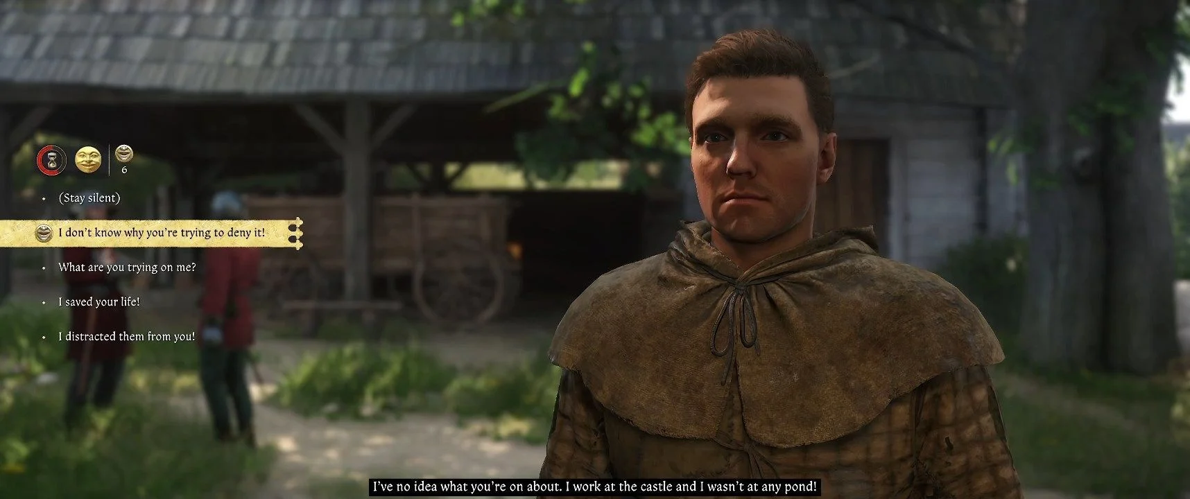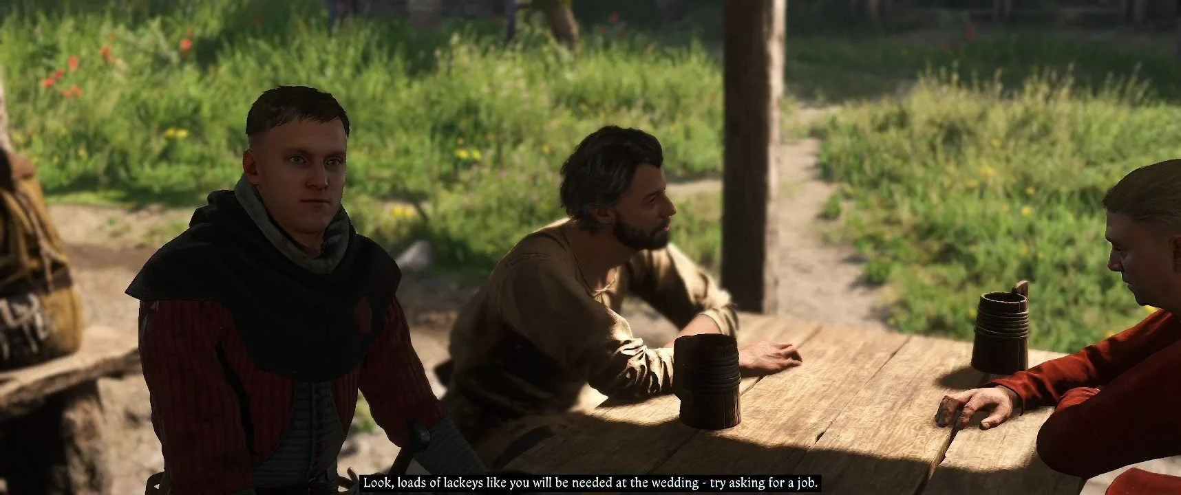 Продолжая, вы можете спросить трактирщика о свадьбе, на которой присутствует искомый лорд. Он предложит обратиться к Дрозду, сидящему за столом с Гансом. Дрозд может порекомендовать вам помочь мельнику или кузнецу, чтобы попасть на свадьбу в качестве рабочего. Он также предложит сыграть в кости, но будьте осторожны: он обманет вас.