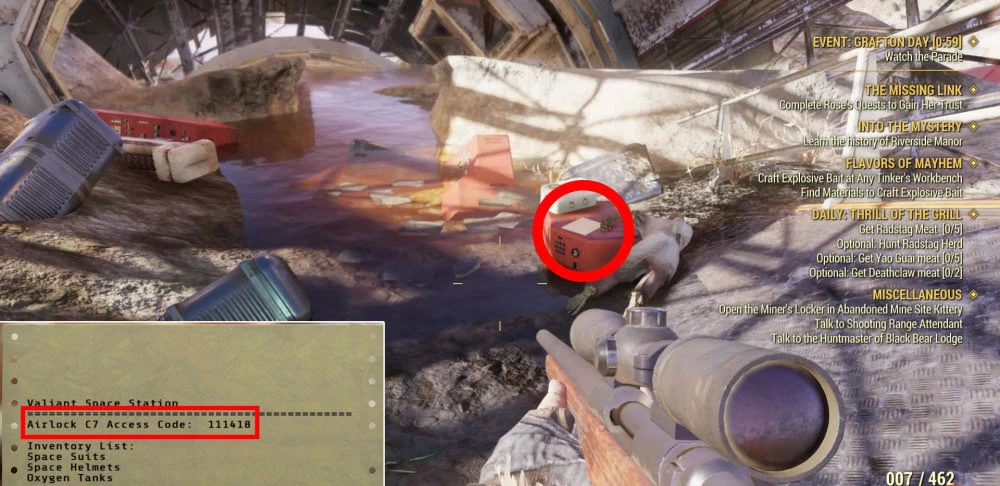Код доступа к воздушным шлюзам с разбитой космической станции находится в одной из частей космической станции. Это небольшая часть станции, в основном состоящая из арматур, с которых слетела обшивка. Код доступа находится на листе бумаги с названием Airlock C7 Inventory List. Он находится на красном оборудовании, рядом с аптечкой. Код был «111418», но он может отличаться от вашего. Поэтому, лучше знать, где найти код.