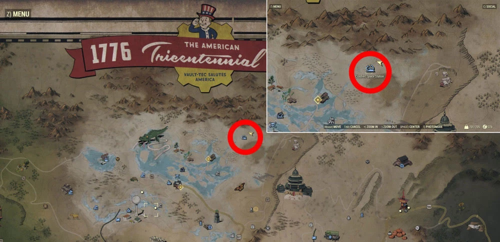 Чтобы найти данную экипировку отправляемся на север. Ваш пункт назначения — разбитая космическая станция (Crashed Space Station), расположенная рядом с северными горами, к северо-западу от озер, к западу от аллигатора (картинка на карте). На карте ниже видно точное местоположение. Разрушенная космическая станция находится в середине пустоши, поэтому не забудьте взять с собой предметы для перемещения.
