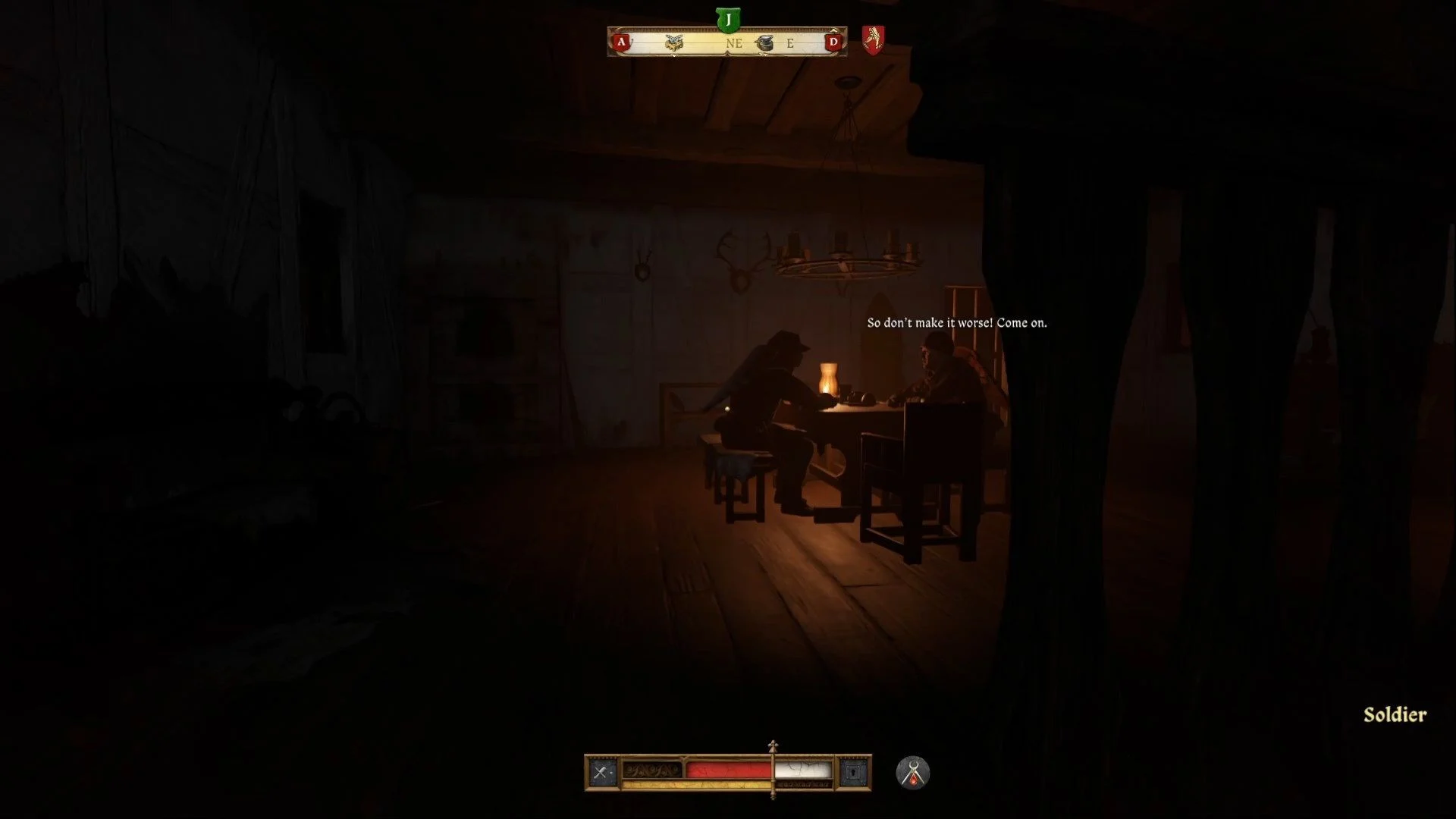Перила приведут вас в «Крону». На верхнем этаже вы обнаружите двоих солдат за столом — дождитесь, пока один из них уйдет в соседнюю комнату, и затем устраните второго. Вы также можете забрать отмычки, которые лежат на столе. После этого охранников больше не будет, и вы сможете продвигаться дальше. На этаже выше в столовой вы, наконец, встретите Иштвана.
