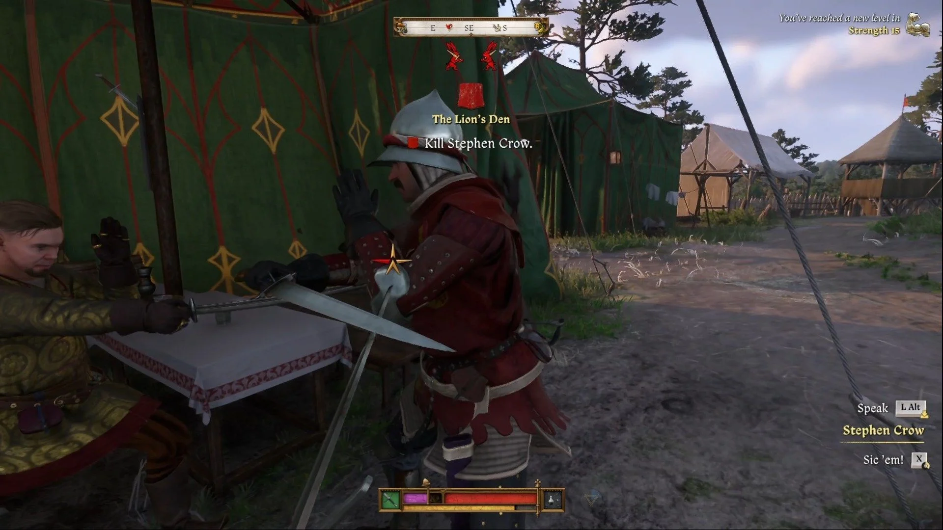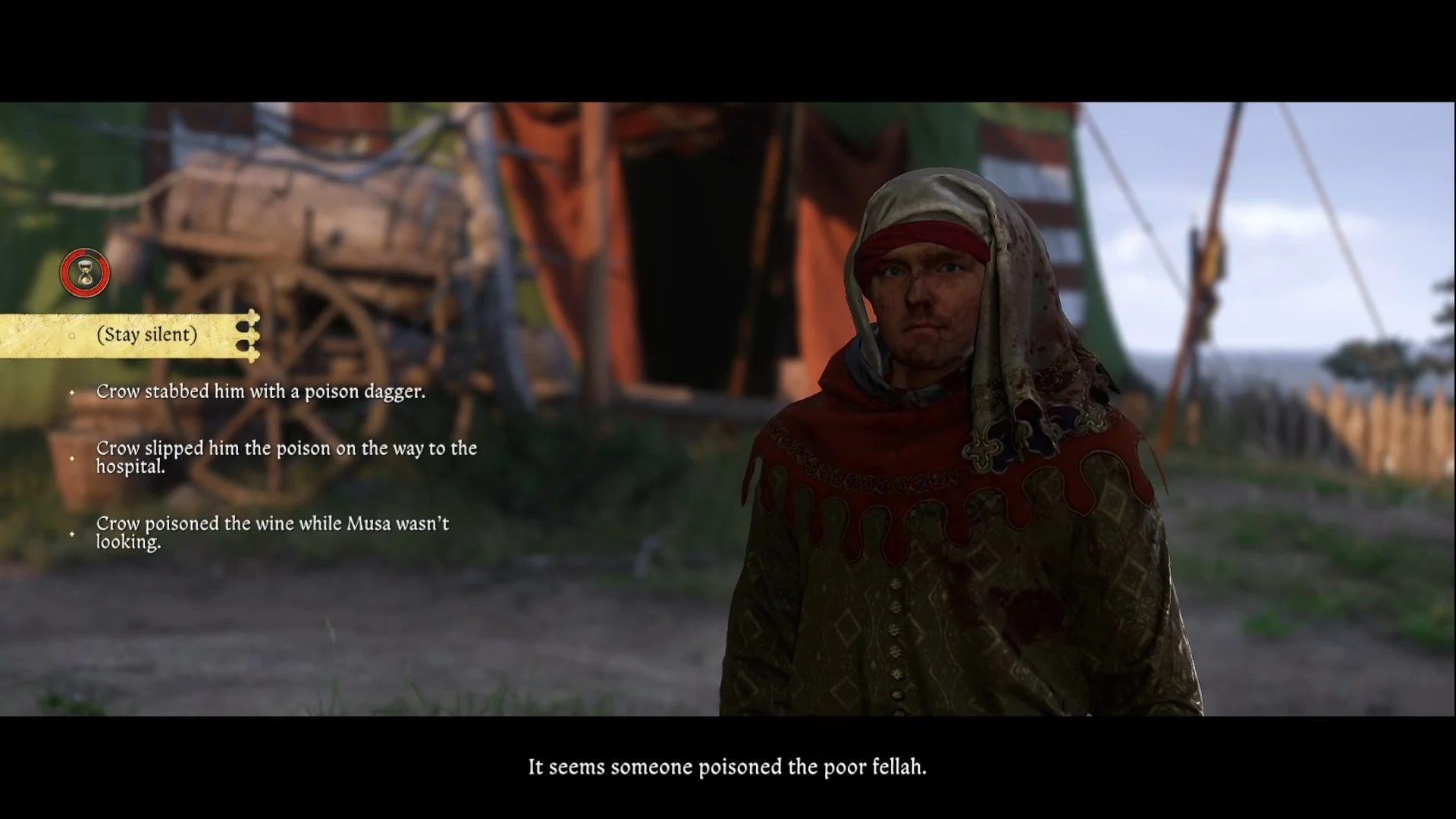 Палатка Мусы не даст полезной информации. В палатке Грозава травы пригодны для яда, но не «Поцелуй смерти». У палаток Адальберта и Радована тоже ничего нет. Однако в палатке Стивена Кроу вы найдете все необходимые ингредиенты. Как закончите, подождите утро и поговорите с Кацем, чтобы начать суд.