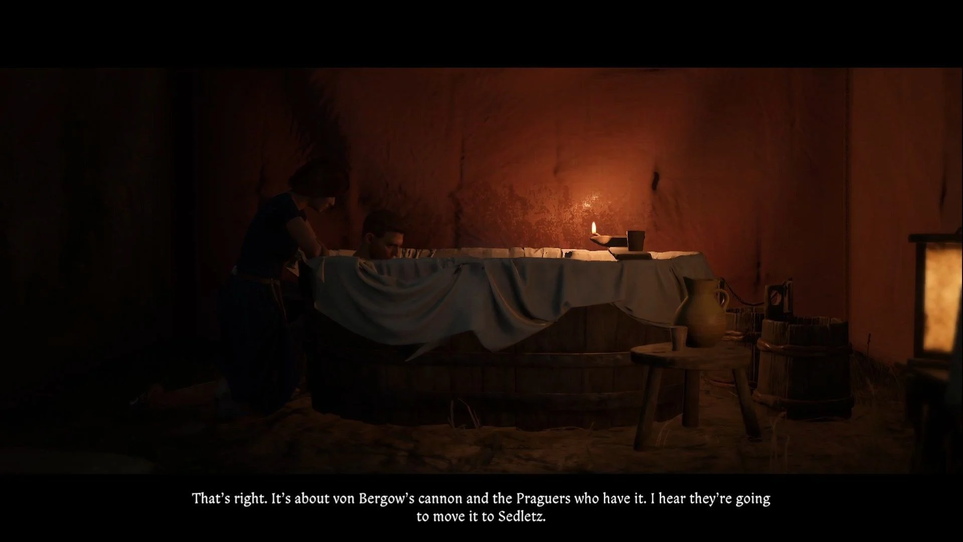 Судья вам кивнет, и солдат, которого вы обвините, получит смертную казнь. После этого он нападет на вас — не забывайте обороняться. Когда все закончится, попросите перерыв у Каца и отправляйтесь в баню. Сообщите Кэтрин о движении колонны с пушкой, чтобы она могла подготовить засаду. После этого поговорите с Кацем и подтвердите, что вы готовы.