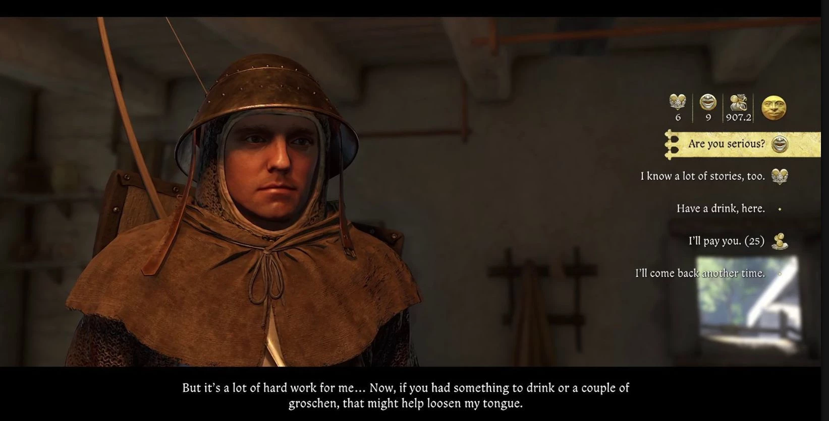 Если вы хотите услышать его историю, вам нужно будет угостить его спиртным. Вы можете заплатить ему 25 грошей за выпивку, предложить свой алкоголь или попытаться уговорить рассказать безвозмездно. Когда он спросит, какую легенду вы желаете услышать, отвечайте, как угодно – Зденек все равно поведает одну и ту же историю.