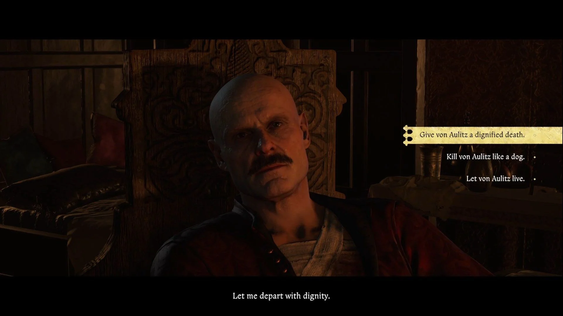 Маркварт, получивший серьезные ранения от Сухого Черта, находится на грани смерти — у него осталось всего несколько часов жизни. Поговорите с ним. В процессе разговора у вас будет возможность заступиться за короля Вацлава (Ученость - Сложный). Но в конце вам нужно будет сделать выбор: дать Маркварту почетную смерть, о которой он просит, сделать это жестоко или просто уйти, позволив ему умереть от полученных ран. Ваш выбор повлияет лишь на финал игры: родители Индржиха подумают о нем лучше, если вы оставите Маркварта в покое.