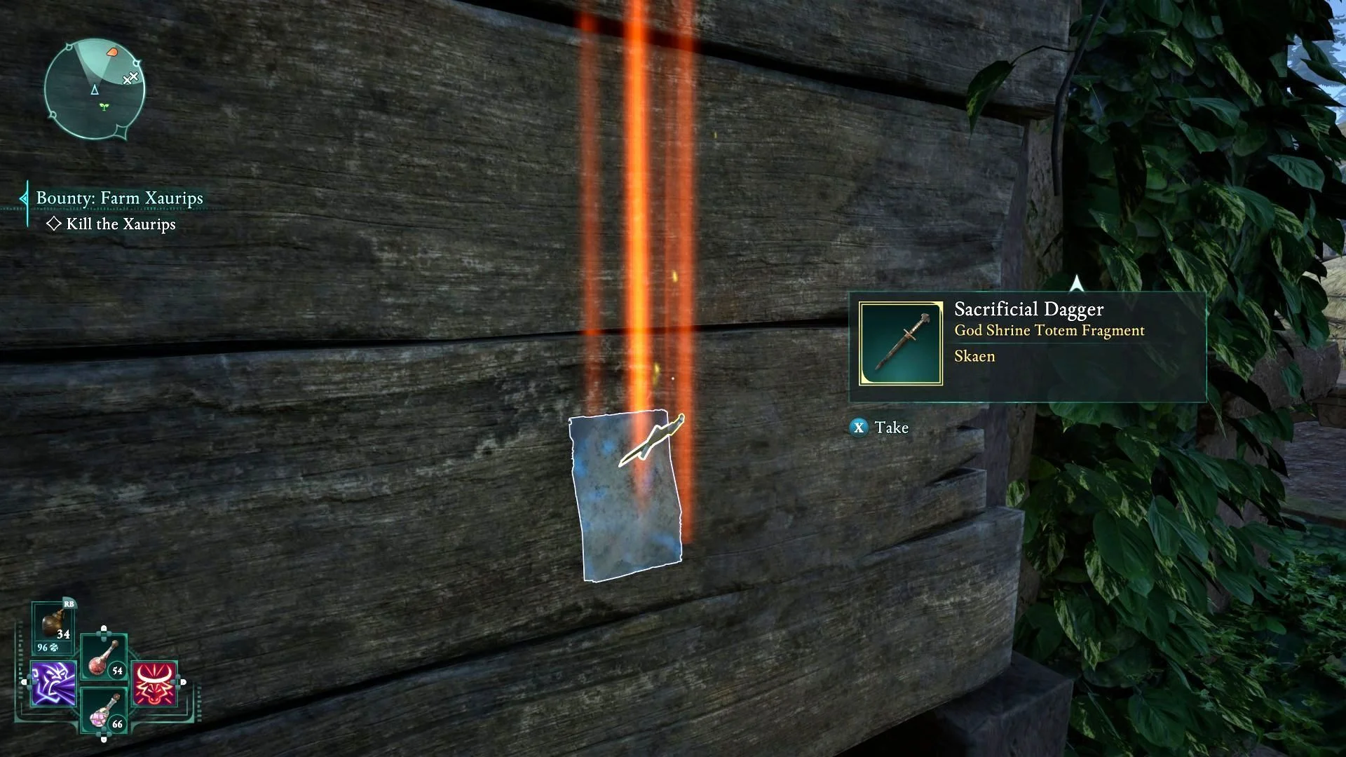 Фрагмент тотема расположен в районе Заброшенных ферм на северо-востоке региона. Вам нужно исследовать склад. Кинжал, который является коллекционным предметом, застрял в стене. Рядом с ним можно найти записку.