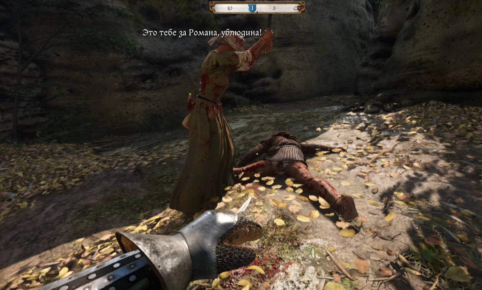 Там вы увидите Павлену, у горла которой зажат нож. Держит его крайне взволнованный юноша по имени Олдра, так что будьте осторожны.