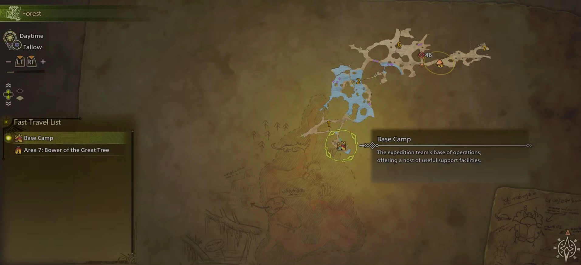 В процессе игры вы обнаружите различные регионы, каждый со своим главным лагерем. Первый из них, лесной лагерь, станет доступен после выполнения квеста "В лес". При быстром перемещении по карте мира, без указания конкретной точки в регионе, вы автоматически окажетесь в соответствующем базовом лагере.