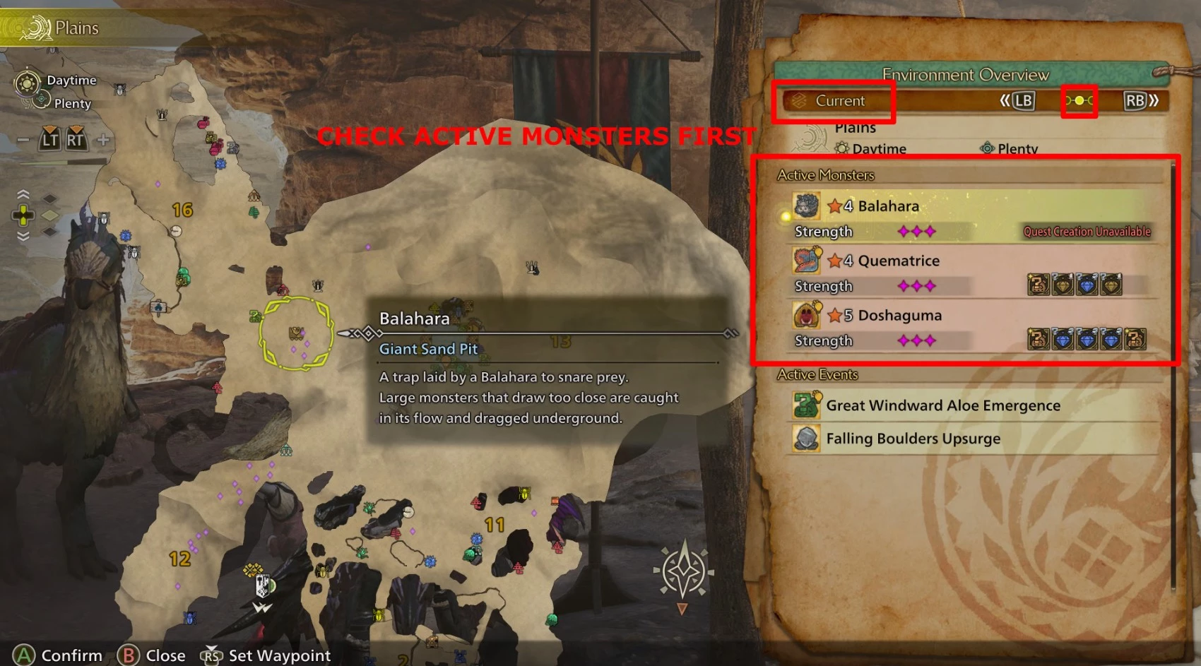 Если Чатакабра отсутствует на вкладке "Текущие", значит, она недоступна в данный момент. Стоит обратиться к вкладке "Прогноз" обзора окружения, чтобы узнать, когда она появится. На этой вкладке представлена таблица с информацией о времени появления крупных монстров в Monster Hunter Wilds.