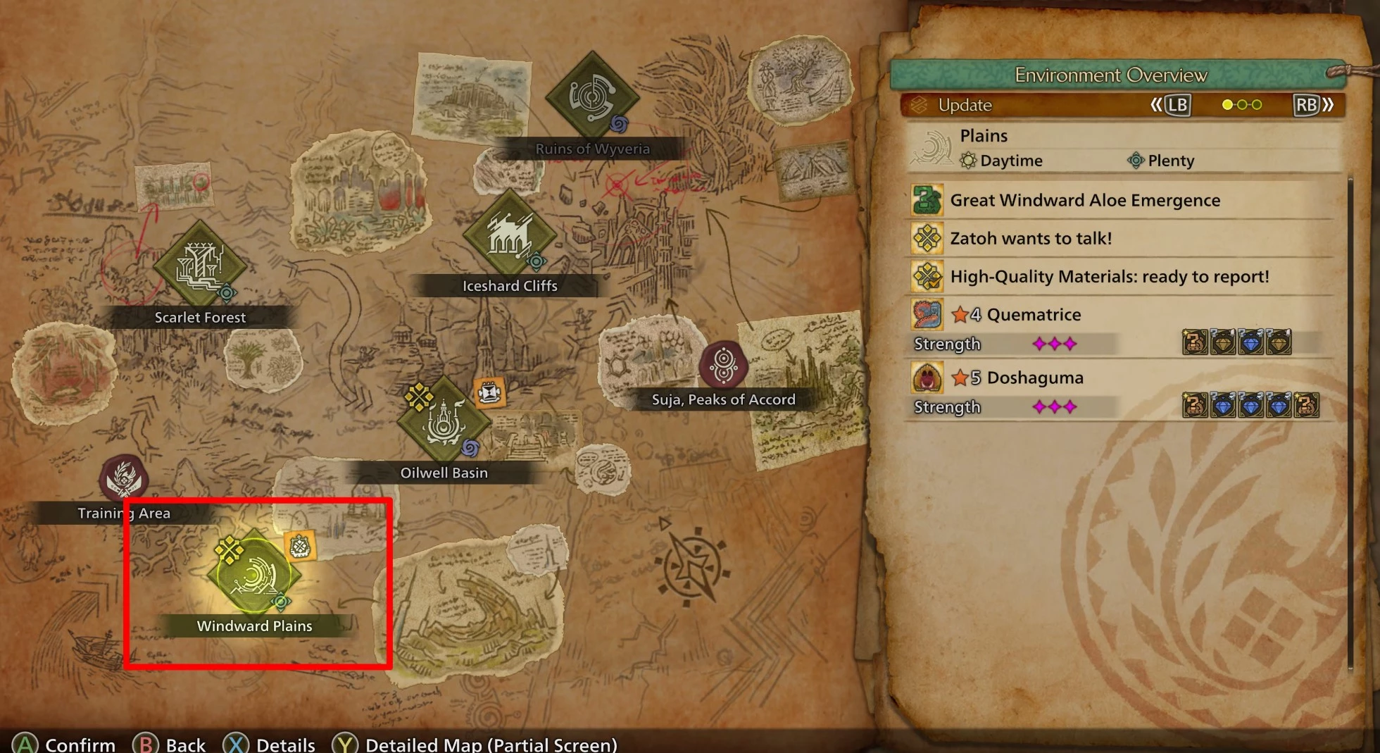 Первым делом перемещаемся в любой лагерь на Windward Plains, самой первой локации в Monster Hunter Wilds. Открываем карту и жмем "Обзор среды" внизу экрана.