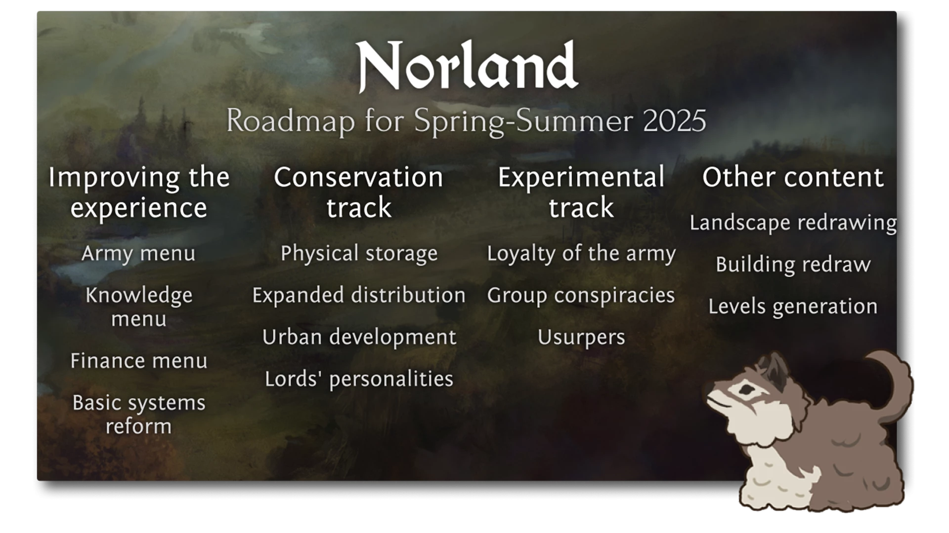 Студия Long Jaunt, разработчики средневековой стратегии Norland, представила планы по развитию игры на ближайшие полгода. Они признали, что предыдущая "дорожная карта" не была выполнена в полном объеме, но уверяют, что время было потрачено не зря. Разработчики выделили три направления развития: консервативное (улучшение основных механик, таких как стены, стража, сюжет), экспериментальное (новые идеи, например, уникальные посетители и механика марионеток) и улучшение опыта игрока (переработка меню и интерфейса).