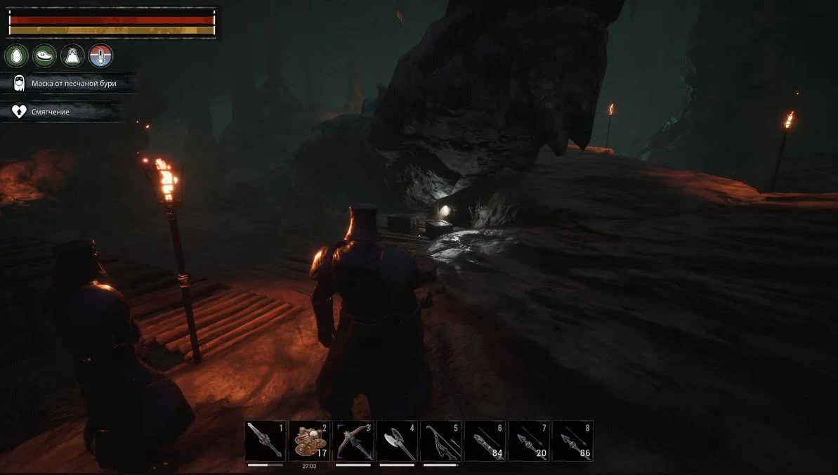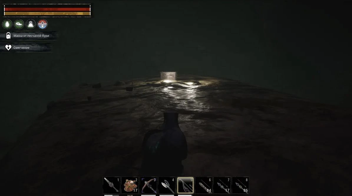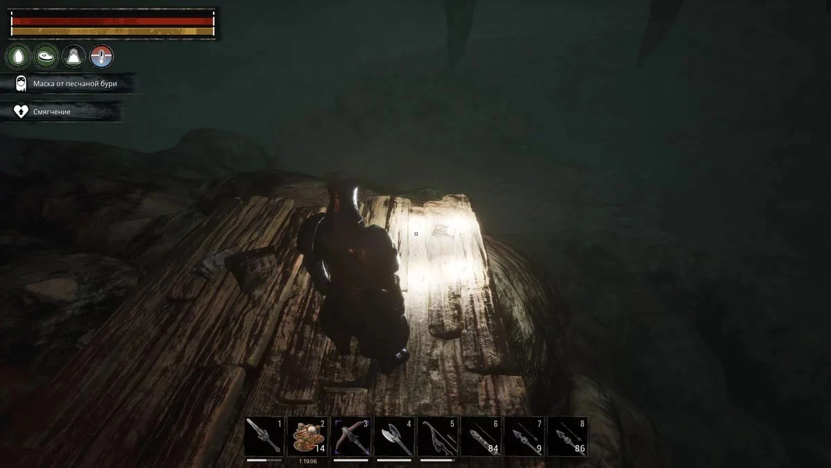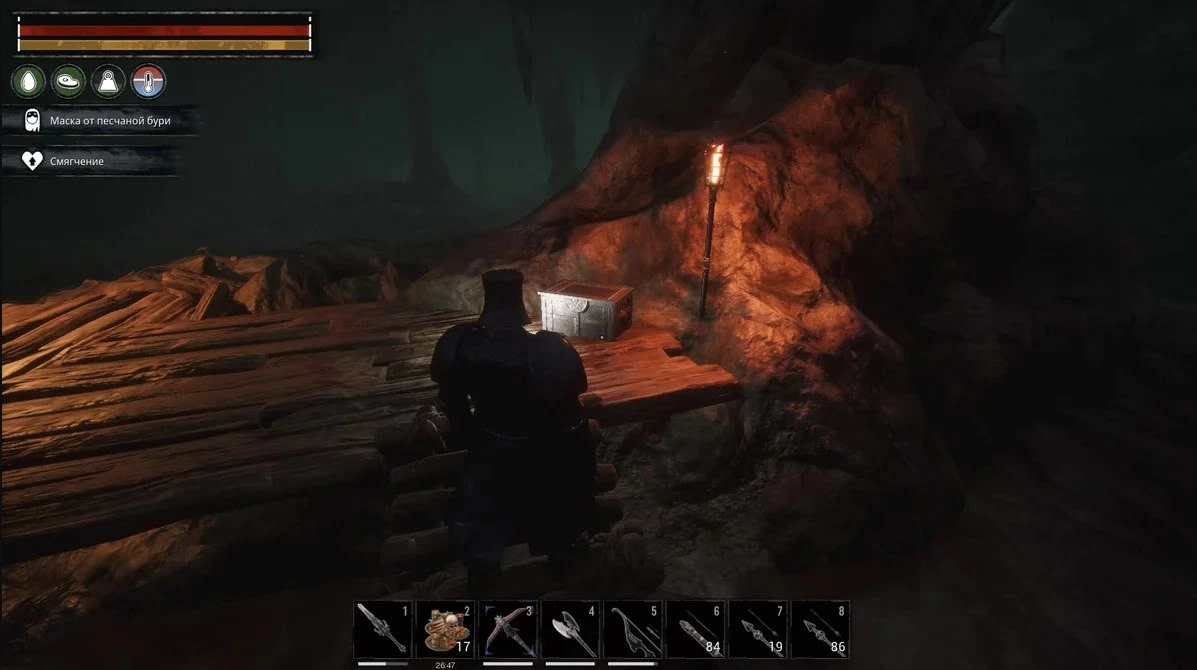 Далее вернитесь к статуе и зайдите за неё. Тут можно пойти двумя путями, по освещенной тропке, к деревянной платформе, или по дорожке между двумя природными колоннами, вглубь пещеры. Вначале сбегайте туда где темно, в конце тропки вы найдете сундук с хламом. А возвращаясь назад, осмотрите нишу, расположенную слева. Там сундук, в котором может быть золото и серебро.