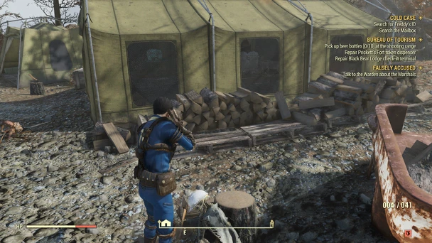 Двигайтесь туда и загляните внутрь палатки в северной части региона. Это относительно небольшая территория, поэтому будет несложно найти бревна, разбросанные по обеим сторонам. Все, что нужно делать — двигаться вдоль стопки и собирать ресурсы на E. За раз вы соберете около 150 единиц древесины.
