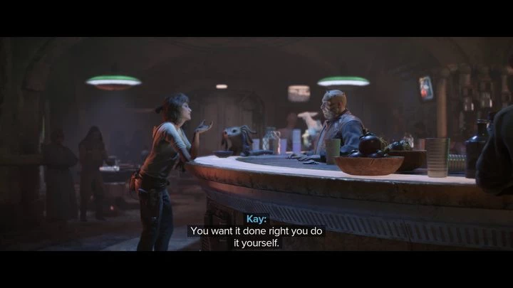 В самом начале игры ты познакомишься с главной героиней, Кей Весс, которая готовится к своему первому заданию. Выйдя из комнаты, ты попадешь в главный зал паба "Broken Hoof". Там нужно поболтать с Брэмом за стойкой. Он даст тебе сломанный инфо-шип, штуковину, которая открывает замки и не только.