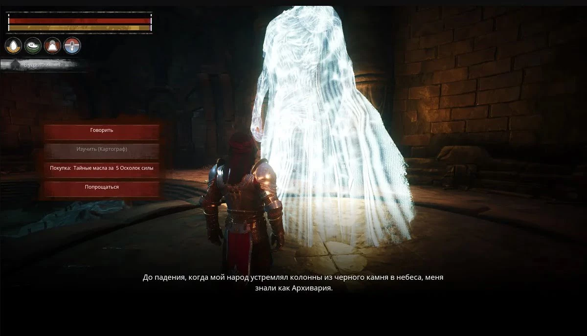 Последнее место, где можно потратить Осколки Силы, находится в Безымянном Городе. А если быть точнее в Архивах. Попасть туда довольно легко, особенно если вы уже открыли обелиск. От него бегите на север в большое здание. Там вас будет ждать Архивариус. Помимо обучения Картографии. Он может обучит вас рецептам Тайных Масел. Всего за пять Осколков Силы.